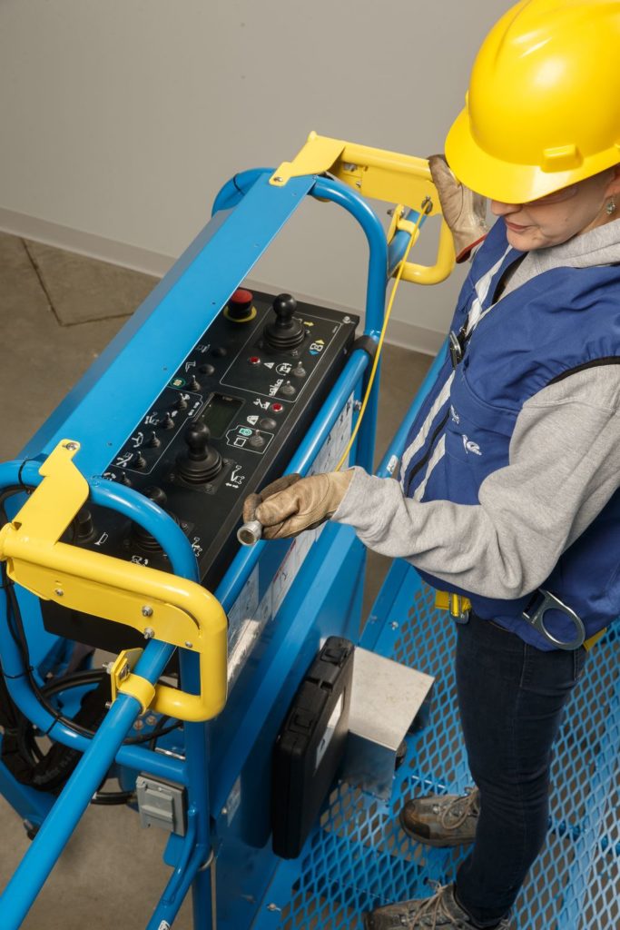 Tutte le funzioni di sollevamento e traslazione della macchina vengono bloccate per impedire ulteriori movimenti della piattaforma. Allo stesso tempo, un allarme luminoso e sonoro avvisa il personale a terra che l’operatore potrebbe aver bisogno di assistenza. Gli allarmi restano in funzione fino a che il sistema viene resettato, grazie al semplice riposizionamento del cavo nel suo alloggiamento.