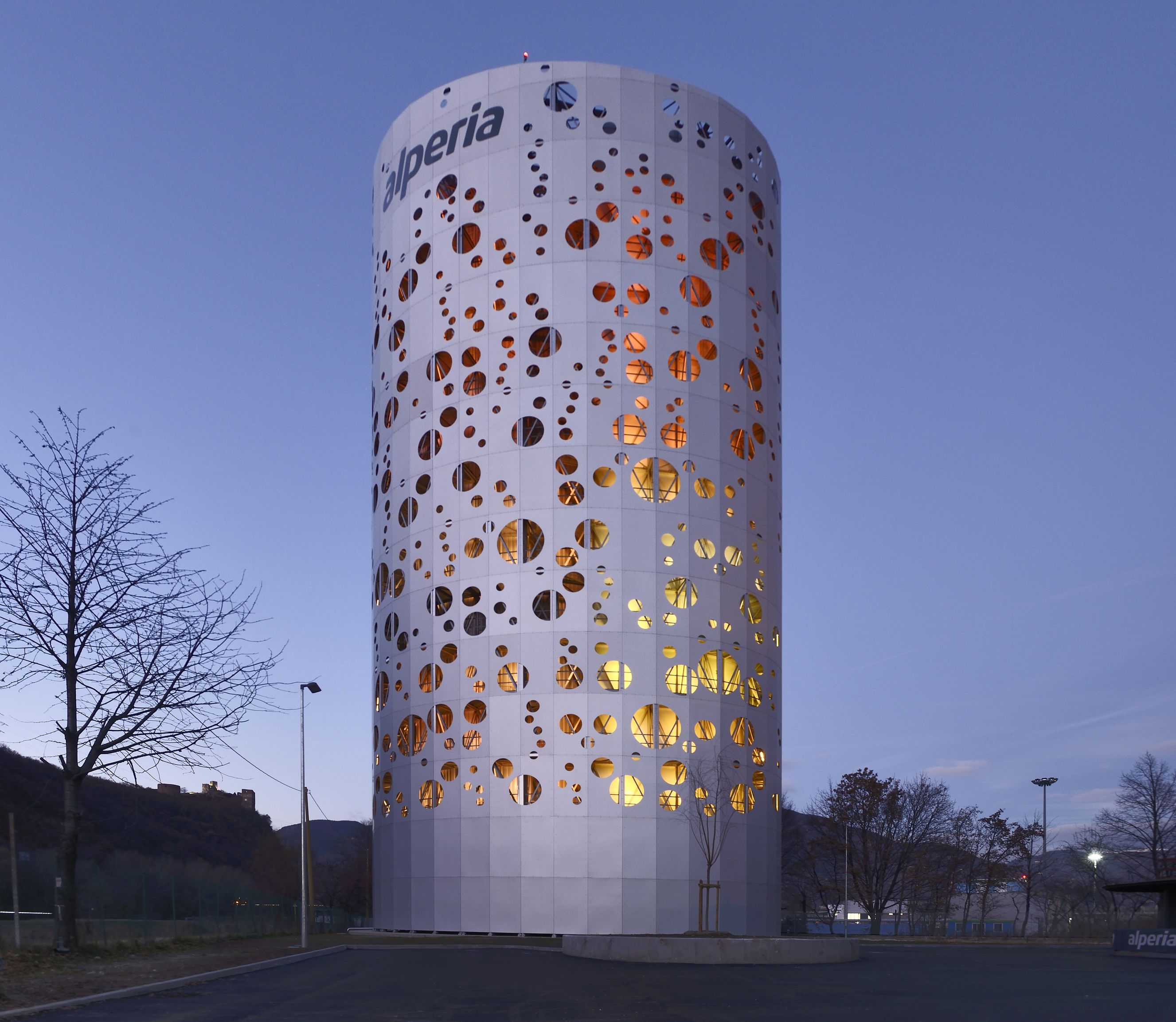 Nelle ore notturne invece Alperia Tower viene letteralmente inondata da giochi di luce: fasci luminosi disegnano spirali che scivolano verso l’alto dando interpretazioni cromatiche del caldo e 1 del freddo: rosso, arancione e giallo si alternano dunque ai toni del blu e del celeste tendendo al bianco sulla sommità. Poi scendendo nella loro versione lattea lungo il serbatoio generando una sorta di nuvola di vapore, per poi scemare lasciando spazio all’oscurità.