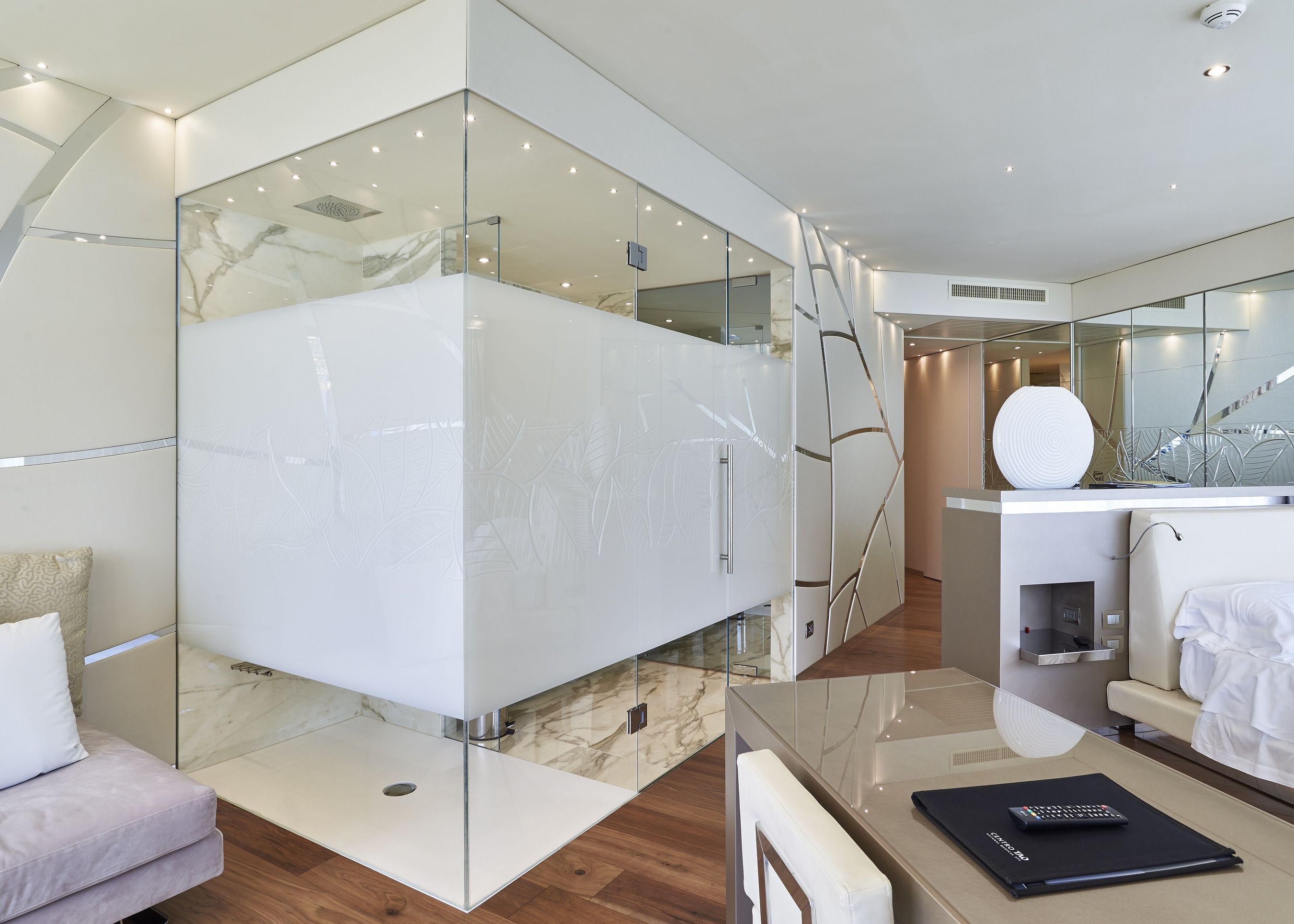 Pilkington Optiwhite™ è stato utilizzato nella tipologia da 10 mm, temprato e stratificato (10 + 10 mm, con intercalare di pvb rigido da 1,52 mm) per la realizzazione dei parapetti esterni, successivamente serigrafati in digitale con un effetto sfumato, di colore bianco. Lo stesso prodotto è stato inoltre utilizzato per la realizzazione di box bagno all’interno di alcune suite, verniciandolo di bianco all’esterno per garantire la dovuta riservatezza e intimità. Grazie al suo processo produttivo e all’accurata selezione delle materie prime, Pilkington Optiwhite™ è estremamente neutro, ideale quando deve essere verniciato o quando i bordi sono deliberatamente posti in evidenza.