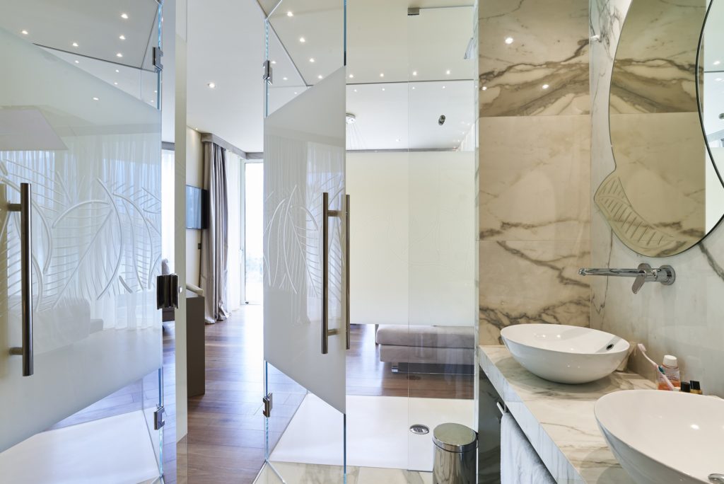 Grazie alla sua versatilità, è stato installato nelle porte, applicando direttamente sul vetro gli elementi di fissaggio delle cerniere metalliche e le maniglie. L’eliminazione del profilo metallico per la tenuta del vetro, a favore di punti di ancoraggio, lo rende un elemento decorativo di elevato valore estetico. Ideale per gli ambienti bagno, il suo rivestimento molto resistente non teme l’umidità ed è di facile lavorazione per gli addetti ai lavori, consentendo tempra, stratifica, incisione ecc. Con lo stesso prodotto sono stati realizzati gli specchi sopra i lavandini.