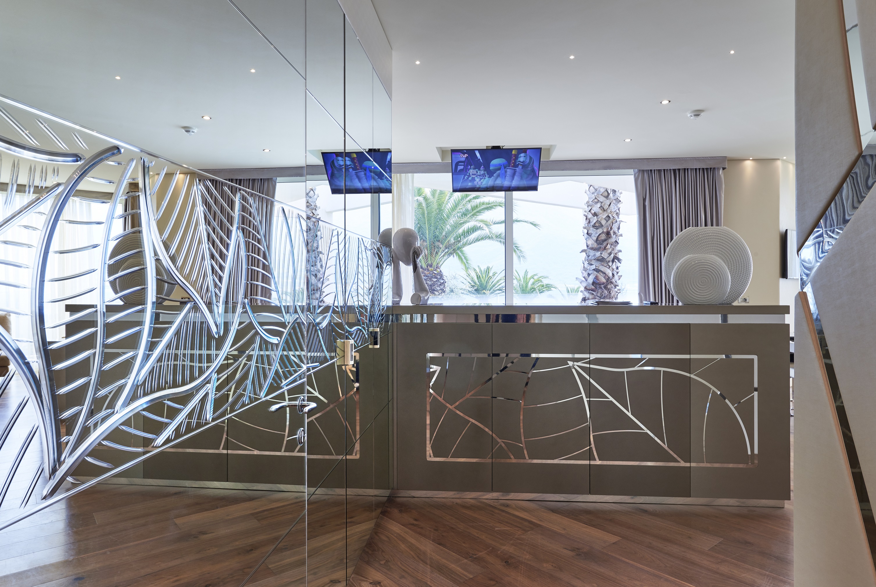 Pilkington Mirropane™ Chrome Plus, appositamente realizzato per le parti a specchio, è stato impiegato nella versione da 10 mm e temprato. Vetro con rivestimento altamente riflettente, è stato abilmente lavorato tramite incisione a controllo numerico e mediante l’applicazione di pannelli in colore bianco, creando ramificazioni e motivi di foglie.