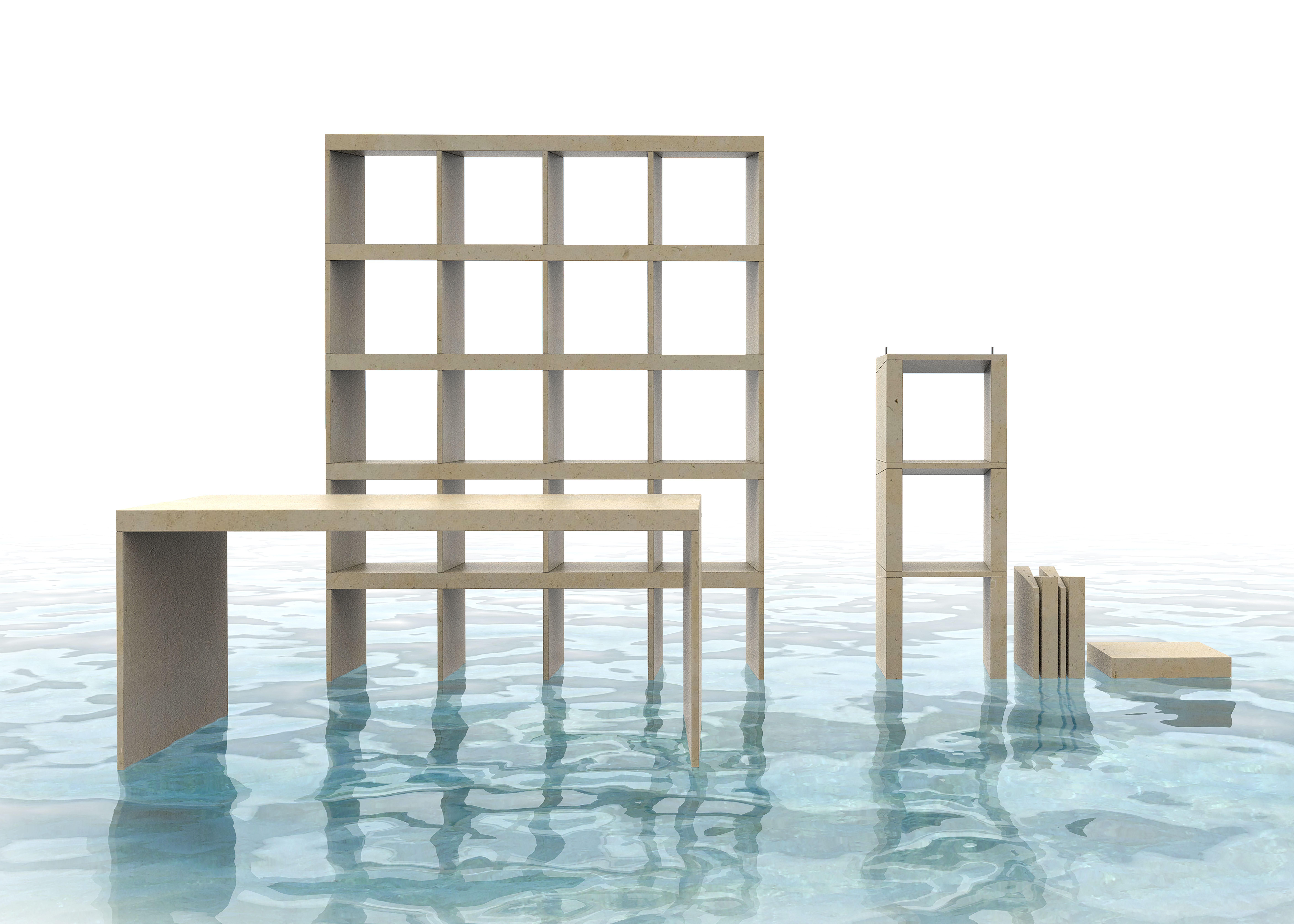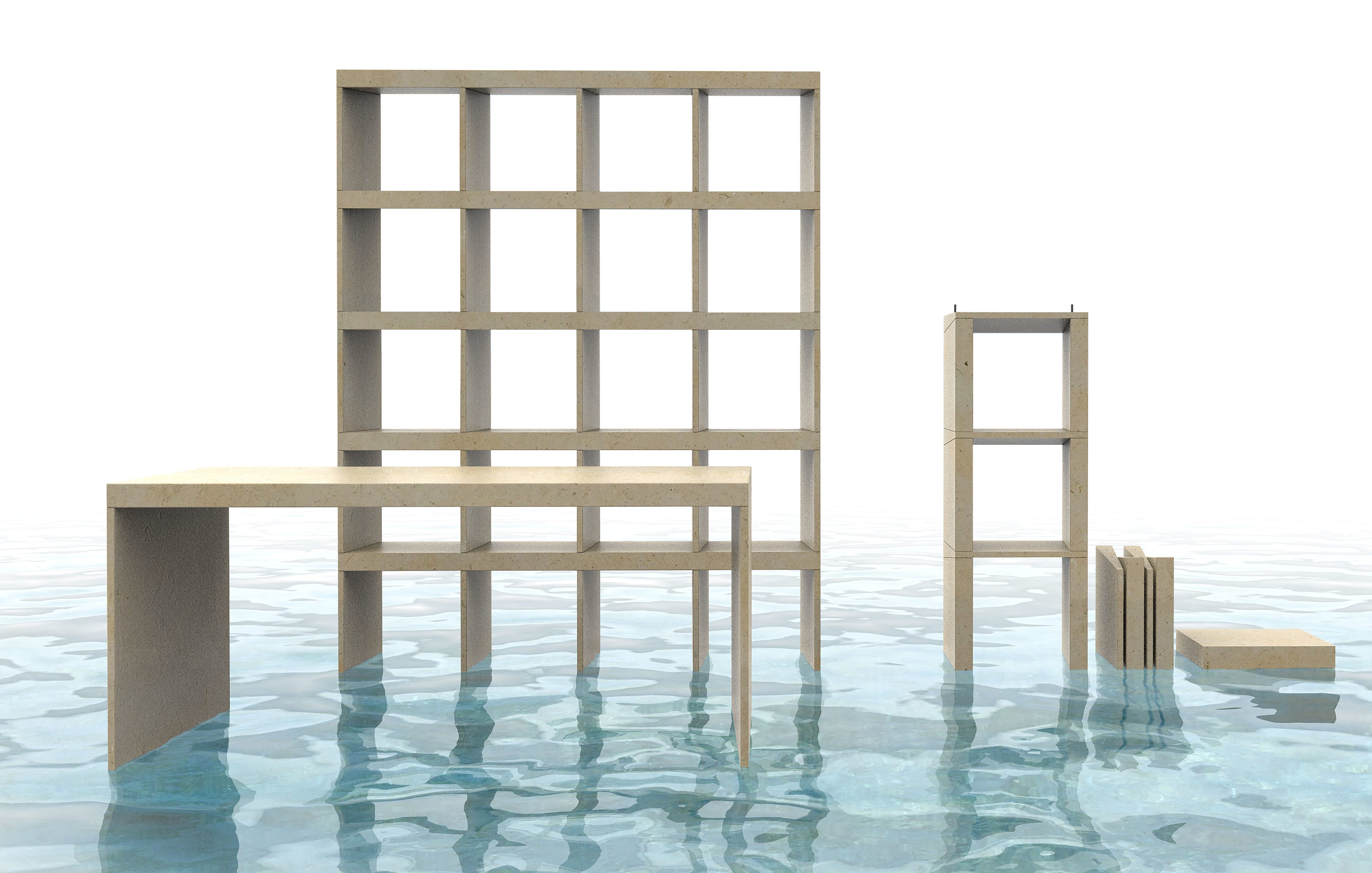 È un progetto innovativo che dichiara il rapporto dell’uomo con la natura attraverso la declinazione strumentale, ovvero per mezzo dell’utilizzo dei macchinari, per creare e produrre una soluzione d’arredo armoniosa che nasce dalla pietra. Prospettive è composta da una libreria componibile e da un tavolo, soggetti all’apparenza banali, ma in questo caso realizzati seguendo il tema della prospettiva che modifica il senso strutturale degli elementi a seconda di come si osserva l’opera. I piani che formano la libreria e il tavolo, visti di profilo, seguono la particolare forma di un triangolo rettangolo allungato. Sei le misure dei moduli: