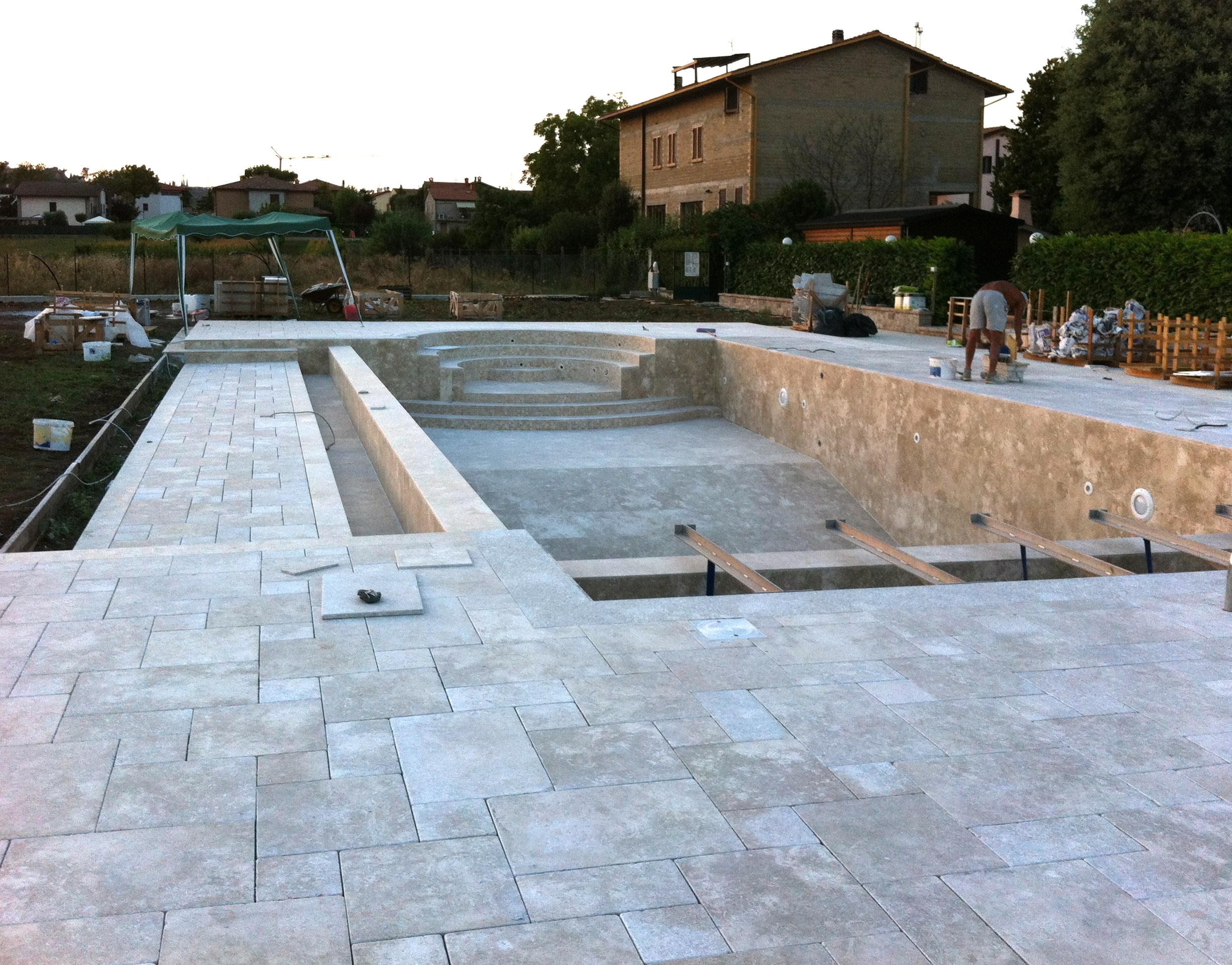 La piscina durante i lavori | Le pedate della scala sono state lavorate con idrofiammatura, che garantisce la precisione nel taglio, mentre per le alzate sono state scelte tessere di mosaico. Il sigillante cementizio ad alte prestazioni di Litokol Litochrom 1-6 nel colore Jasmine è stato utilizzato per sigillare le fughe tra le lastre.