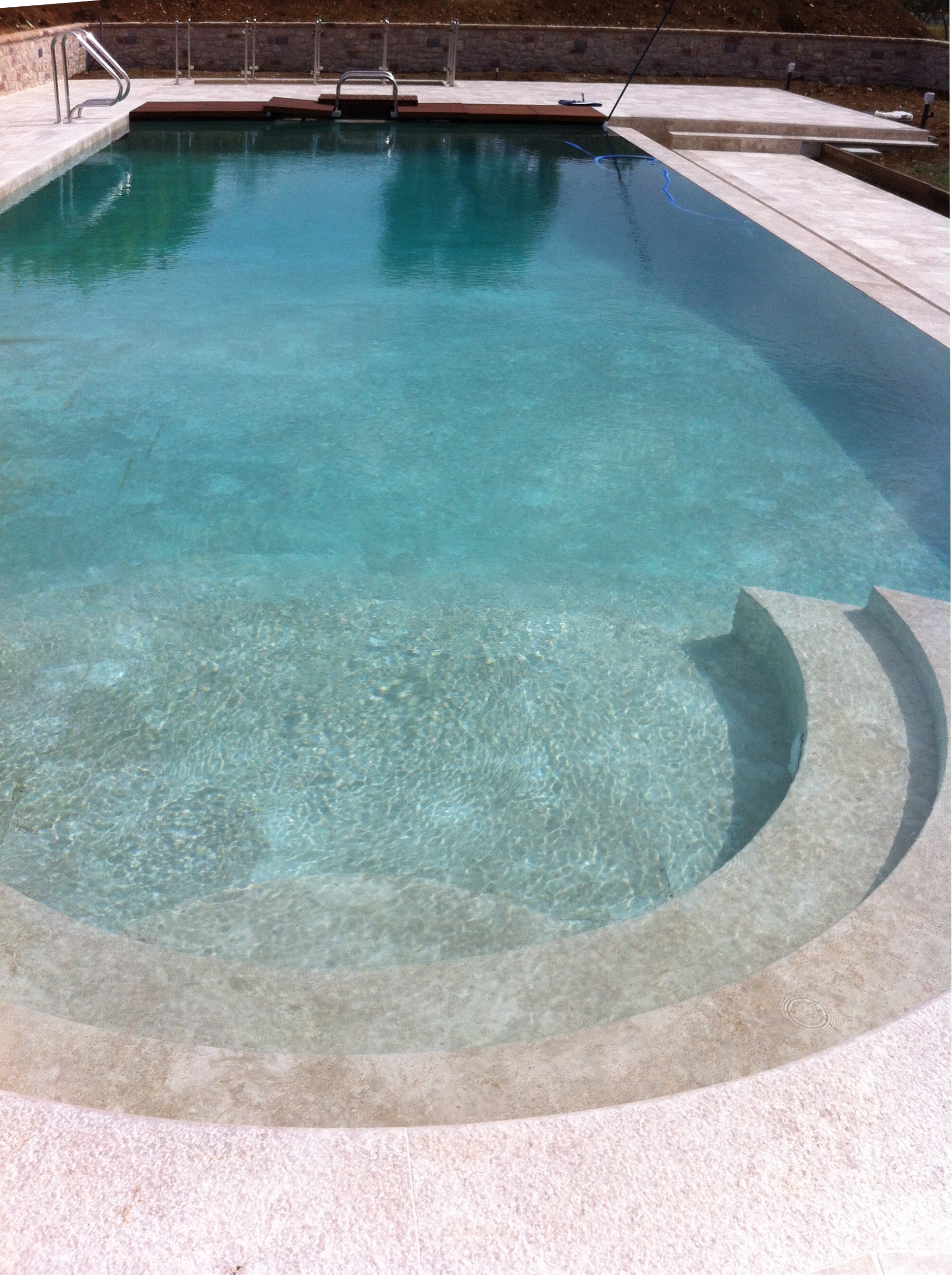 «La scelta dei materiali utilizzati per la posa e la stuccatura della pietra di Gerusalemme è stata fatta in funzione delle elevate sollecitazioni meccaniche a cui è sottoposta una struttura in immersione d’acqua continua. L’adesivo cementizio migliorato Litoflex K80 Bianco, classificato C2te secondo la normativa Uni En 12004, idoneo per la posa di ceramiche e pietre naturali dimensionalmente stabili, è stato miscelato integralmente con lattice elasticizzante Latexkol per conferire altissima deformabilità (classe S2 secondo normativa Uni En 12002). La stuccatura, in rapporto all’esigua ampiezza di fuga realizzata, è stata eseguita con il sigillante cementizio Litochrom 1-6, classificato Cg2wa secondo la norma Uni En 13888, al fine di conferire alte resistenze meccaniche e basso assorbimento d’acqua».
