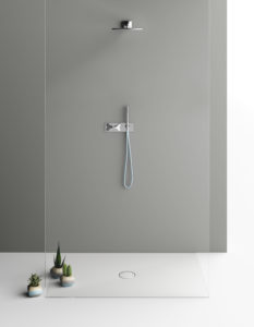 Realizzato in Corian, materiale igienico e naturalmente antiscivolo, il piatto raggiunge un’altezza minima di 30 millimetri.