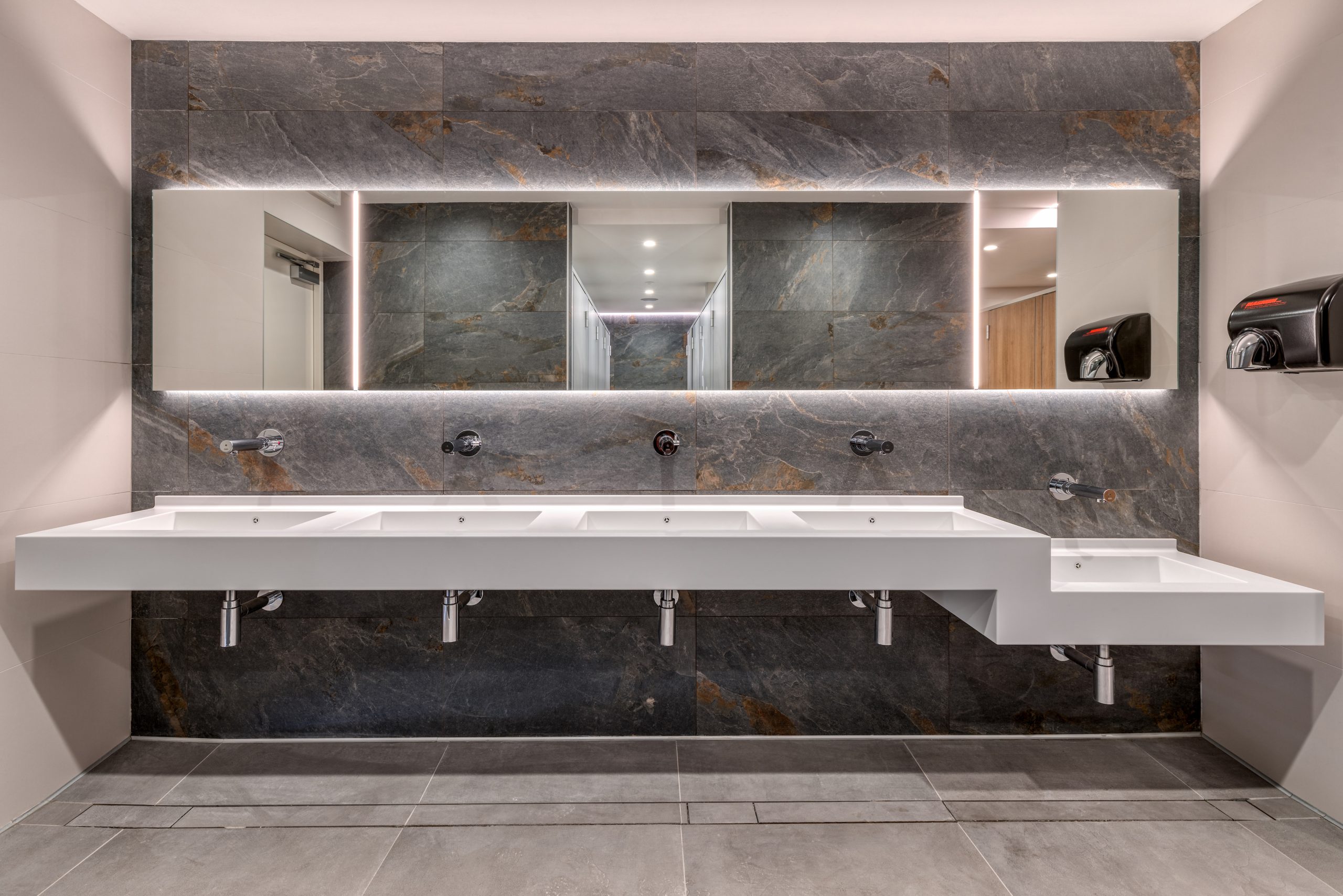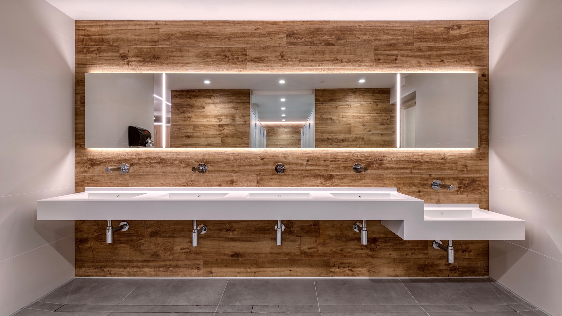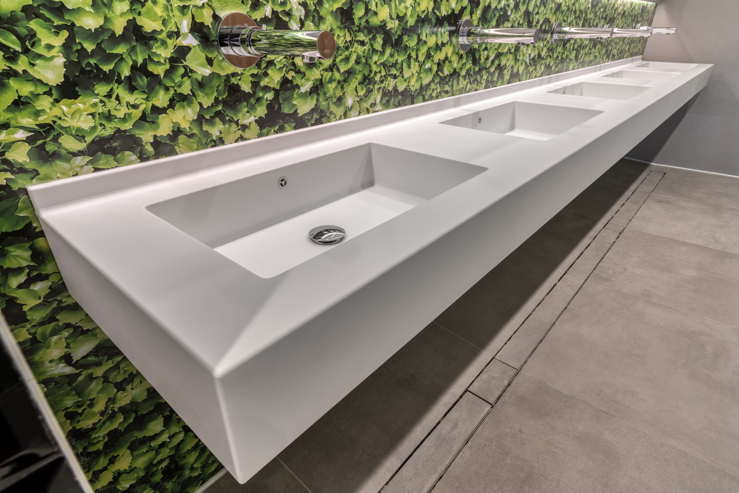 «Abbiamo realizzato i top su misura con lavabi in batteria Quiet 7120, la superficie dei fasciatoi con vasca Natal, lavelli Spicy 965 completi di piani per il lavaggio delle stoviglie, tutto in Corian Glacier White. Al fine di consentire una facile pulizia, tutti i piani sul lato a muro sono provvisti della pratica alzatina raccordata e arrotondata. Corian, grazie alle sue caratteristiche tecniche, è il materiale ideale per spazi ad uso intensivo dove l’igiene deve essere massima» Racconta Hans Simonini responsabile commerciale di Planit e partner.