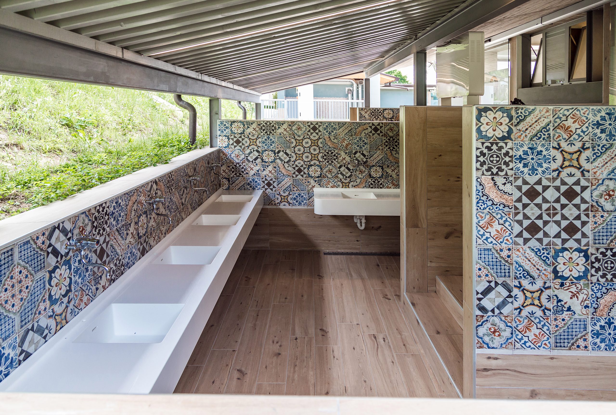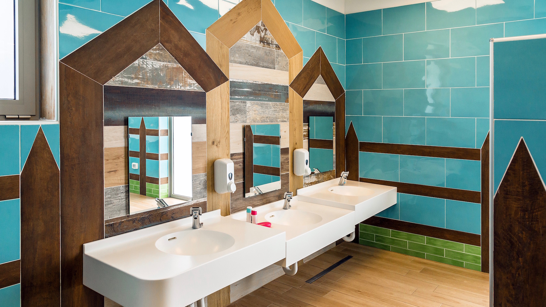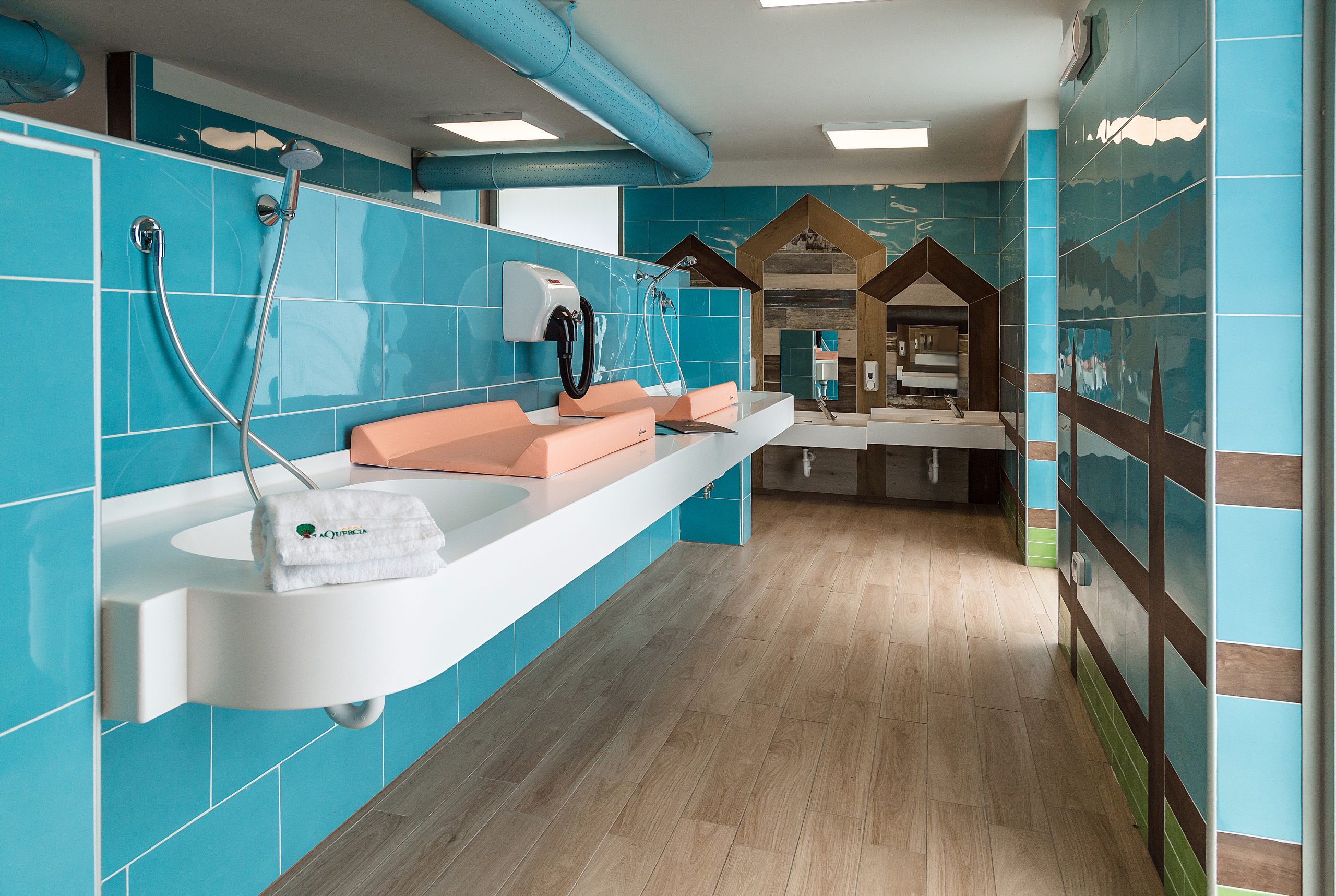 Per i più piccoli è stato realizzato un ampio piano con lavabi ad altezze diverse e sfasate, per soddisfare ogni tipo di necessità di statura. Sono lavabi modello Ibis 3 in solid surface tondi, integrati in un top bagno rettangolare con gli angoli esterni arrotondati.