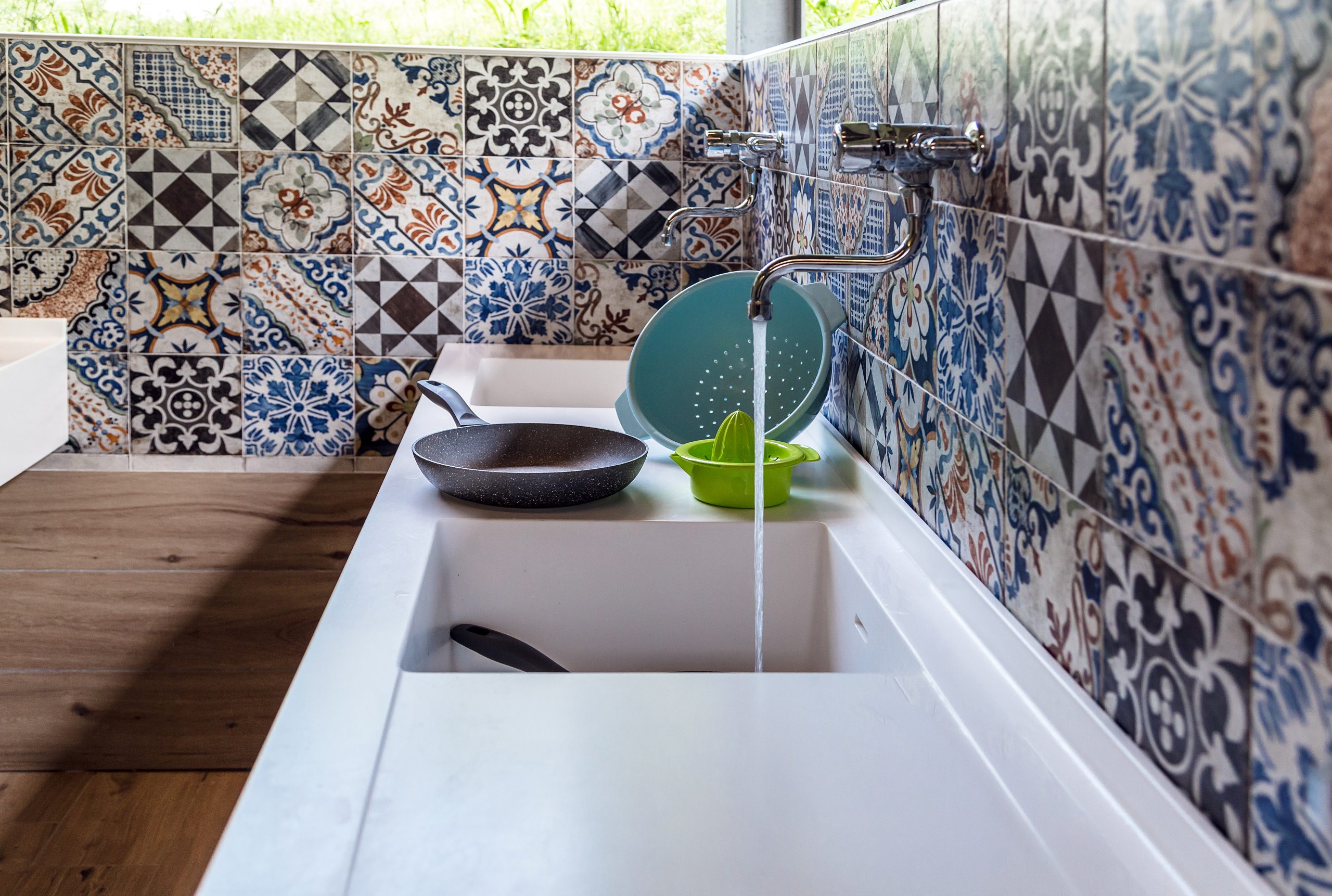 Per gli ambienti comuni sono stati scelti piani, lavelli e lavabi su misura realizzati da Planit in solid surface bianco opaco.