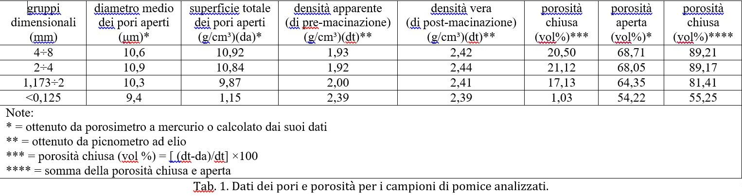 Nel presente studio, la variazione della dimensione dei pori, la distribuzione e la quantità di pori aperti/chiusi di vari campioni di pomice secondo le loro frazioni dimensionali sono state esaminate mediante microscopia elettronica a scansione (SEM), picnometria ad elio e porosimetria a intrusione di mercurio (rif. [4], ove è descritta anche la preparazione dei campioni).