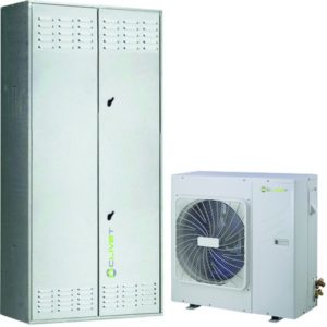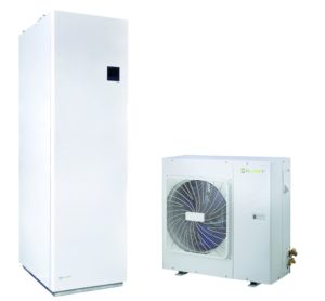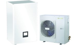 Pompa di calore in due sezioni composta da unità motocondensante esterna con compressore modulante ad inverter e unità interna a box con di modulo idronico collegabile ad un accumulo sanitario.