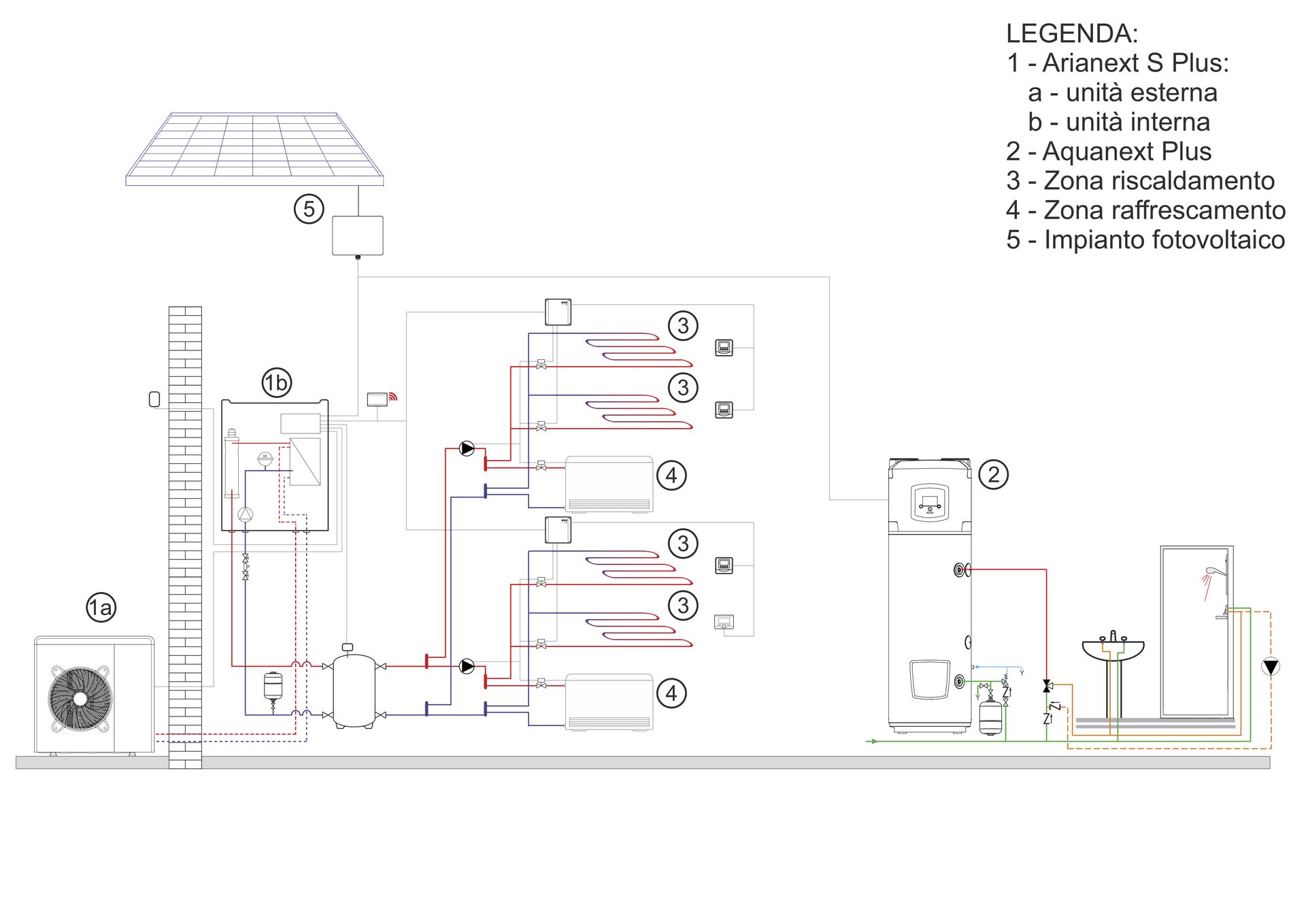 - Pompa di calore aria-acqua splittata per il riscaldamento e raffrescamento ambiente, con un puffer di acqua tecnica con 2 pompe di rilancio a valle. Il sistema ha di serie 2 resistenze da 2 kW.
