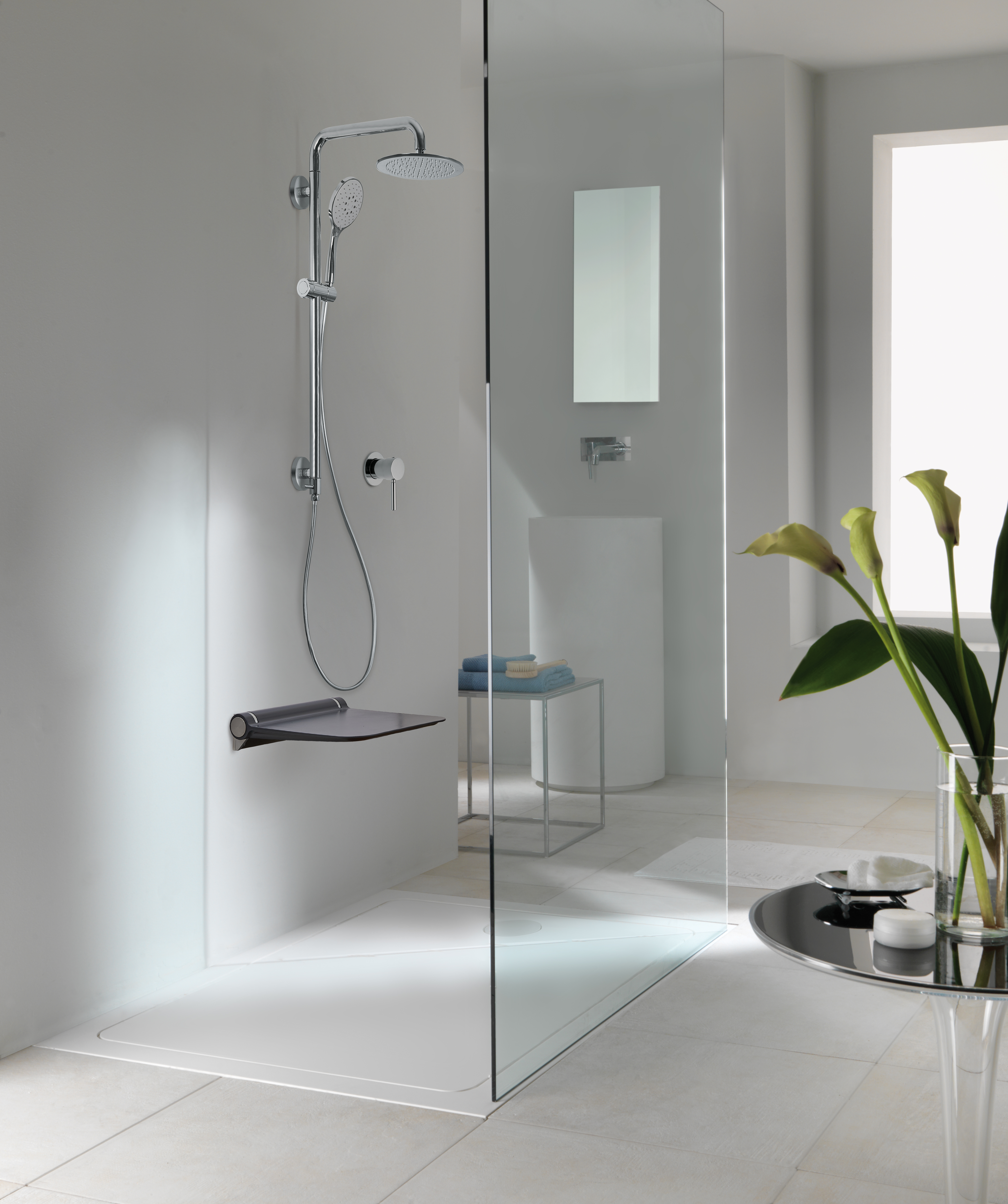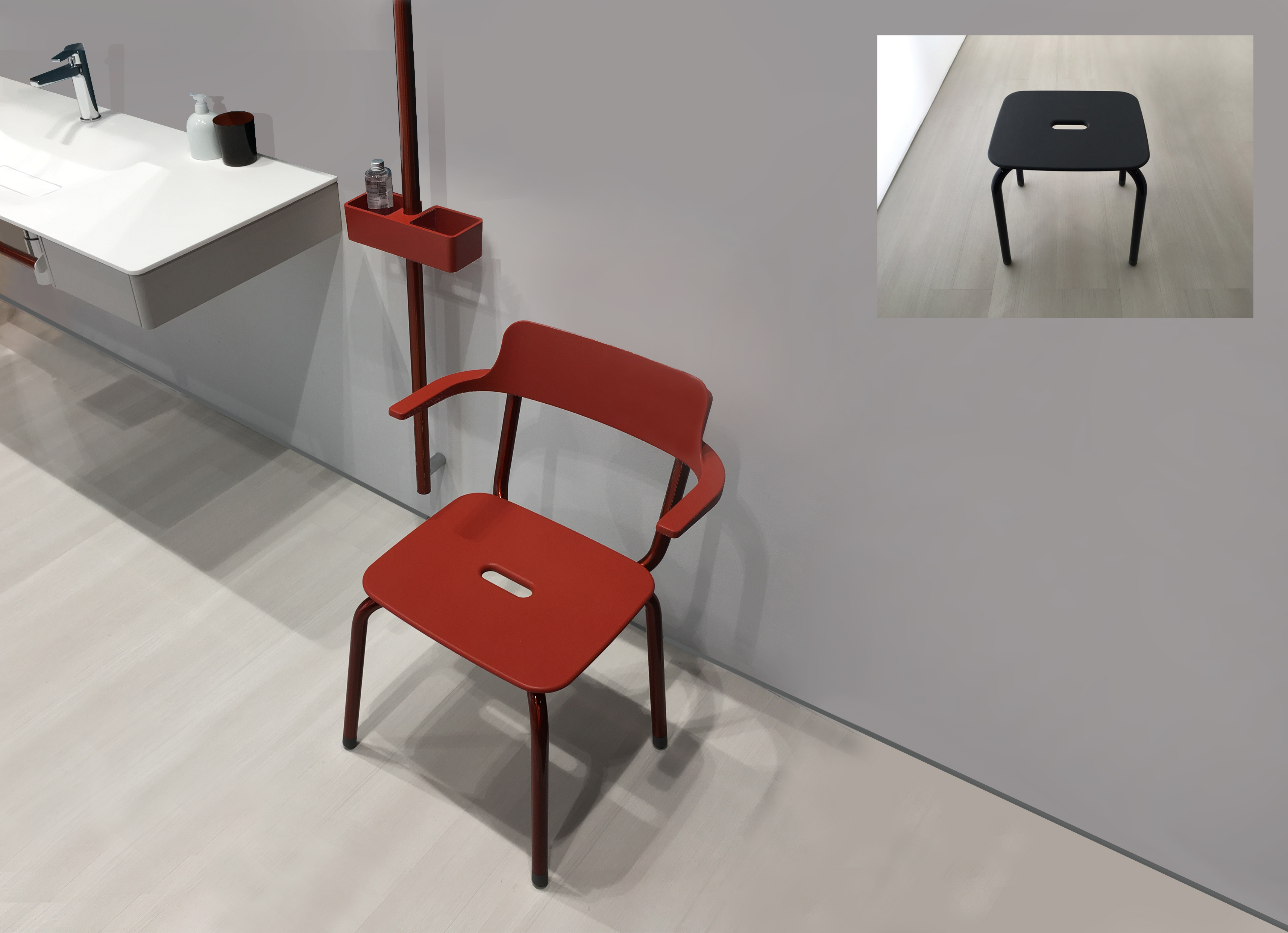 Il sedile doccia in acciaio inox, alluminio e poliuretano, è stato concepito per rispondere a qualunque esigenza di installazione. Sono disponibili diverse colorazioni: bianca, grigia per un contrasto non convenzionale e rossa per chi cerca nuove ispirazioni. Accanto a queste tre colorazioni possono essere realizzati su richiesta tutti i colori del sistema di identificazione dei colori Ral. Lo sgabello e la sedia con braccioli sono disponibili nelle stesse tre finiture di colore standard. Queste due soluzioni sono idrorepellenti e presentano un foro ovale nel centro per migliorare la presa e per consentire all’acqua di defluire.