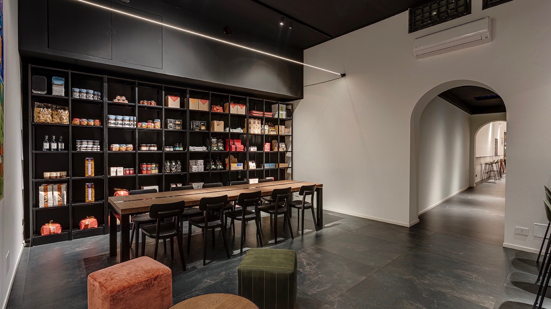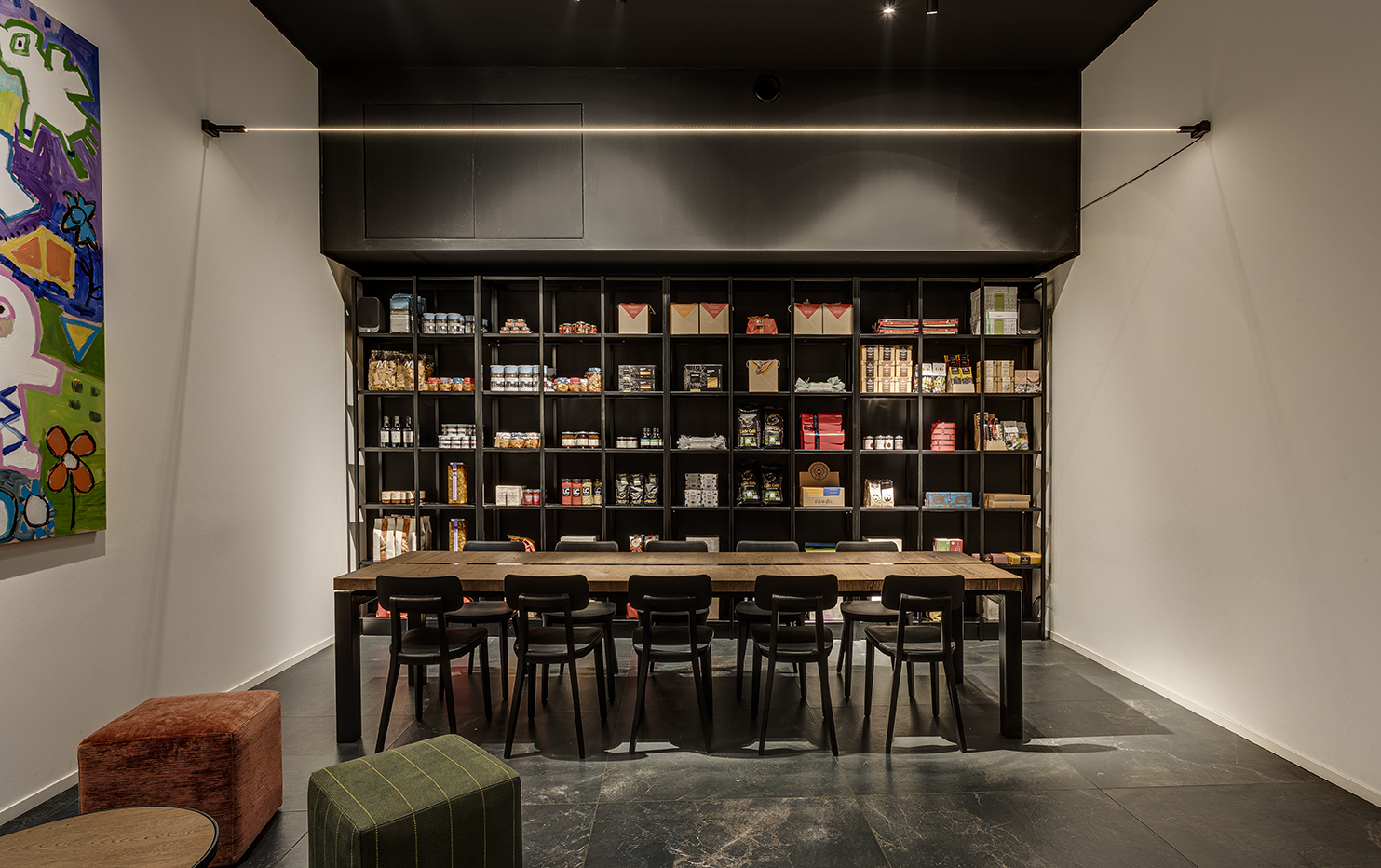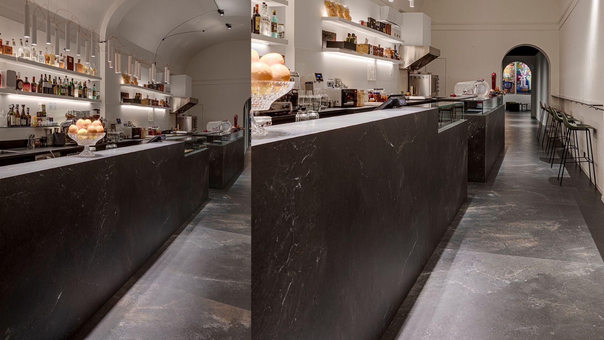 Per questo nuovo caffè sono state impiegate le collezioni: Royal Stone (in formato tradizionale 100×100 cm), Great Royal Stone (formato grande, lastra da 150×300 cm) nella nuance Black Diamond. Il mood del locale è eleganza e ricercatezza: la superficie di Porcelaingres è protagonista del progetto con il suo colore scuro screziato di intrusioni bianche e nuvolature dorate.