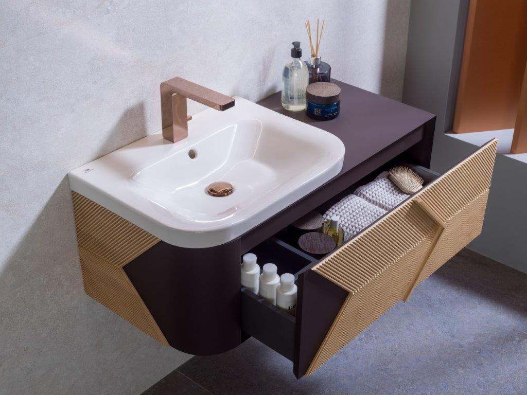 Lounge Espiga prevede un mobile in cui il lavandino è semi-incassato, in legno naturale d’acero con rubinetti in rame, che riproduce alla perfezione i colori della stagione fredda.