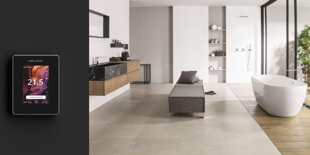 Lo studio di ingegneria del Gruppo Porcelanosa offre un riscaldamento elettrico a pavimento che consente una regolazione della temperatura indipendente e completamente personalizzata in ogni stanza. Il sistema prevede due elementi: termostato 10Gm dal design ultra sottile e integrato nella parete e una rete radiante con una potenza elettrica di 150 W/m².