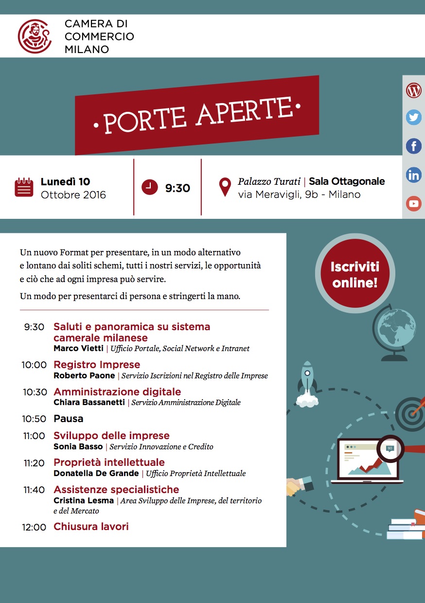 Una mattina a porte aperte: la Camera di Commercio di Milano lunedì 10 ottobre si presenta a tutte le aziende interessate a conoscere più da vicino la sua realtà. Un format alternativo e lontano dai soliti schemi per presentare i servizi, le opportunità e tutto ciò che può servire alle imprese.