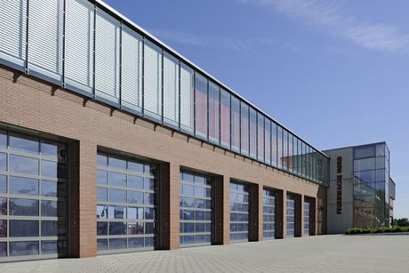 I portoni sezionali in alluminio Hörmann con finestratura a filo del pavimento consentono il passaggio di luce naturale e la massima trasparenza, oltre a integrarsi perfettamente nella facciata dell’edificio.