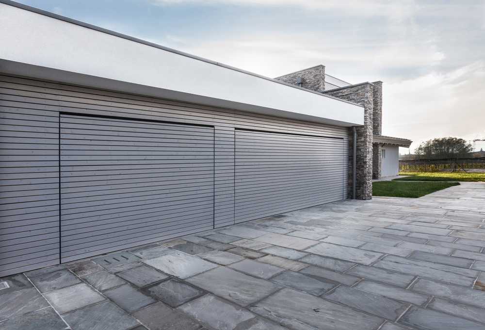 I due portoni sezionali Hörmann installati presso la villa ad Almenno San Bartolomeo sono del modello Alr40, composto da una struttura in profili d’alluminio, leggera e resistente, appositamente studiati per le applicazioni personalizzate in ambito industriale e impiegati, in questo caso, per uniformare il rivestimento esterno all’immagine dell’edificio.