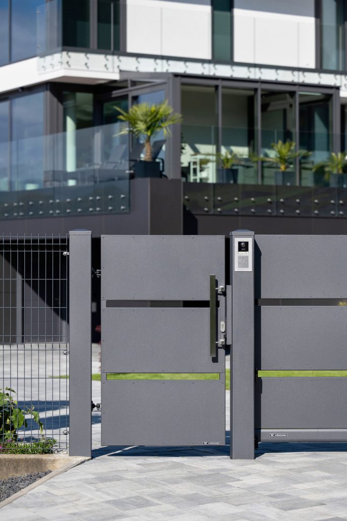 - Recinzione realizzata con cancello automatico, modello Aw 10.110 Modern variante HI Modern Grafite. Pannelli di riempimento in rete modello Vega