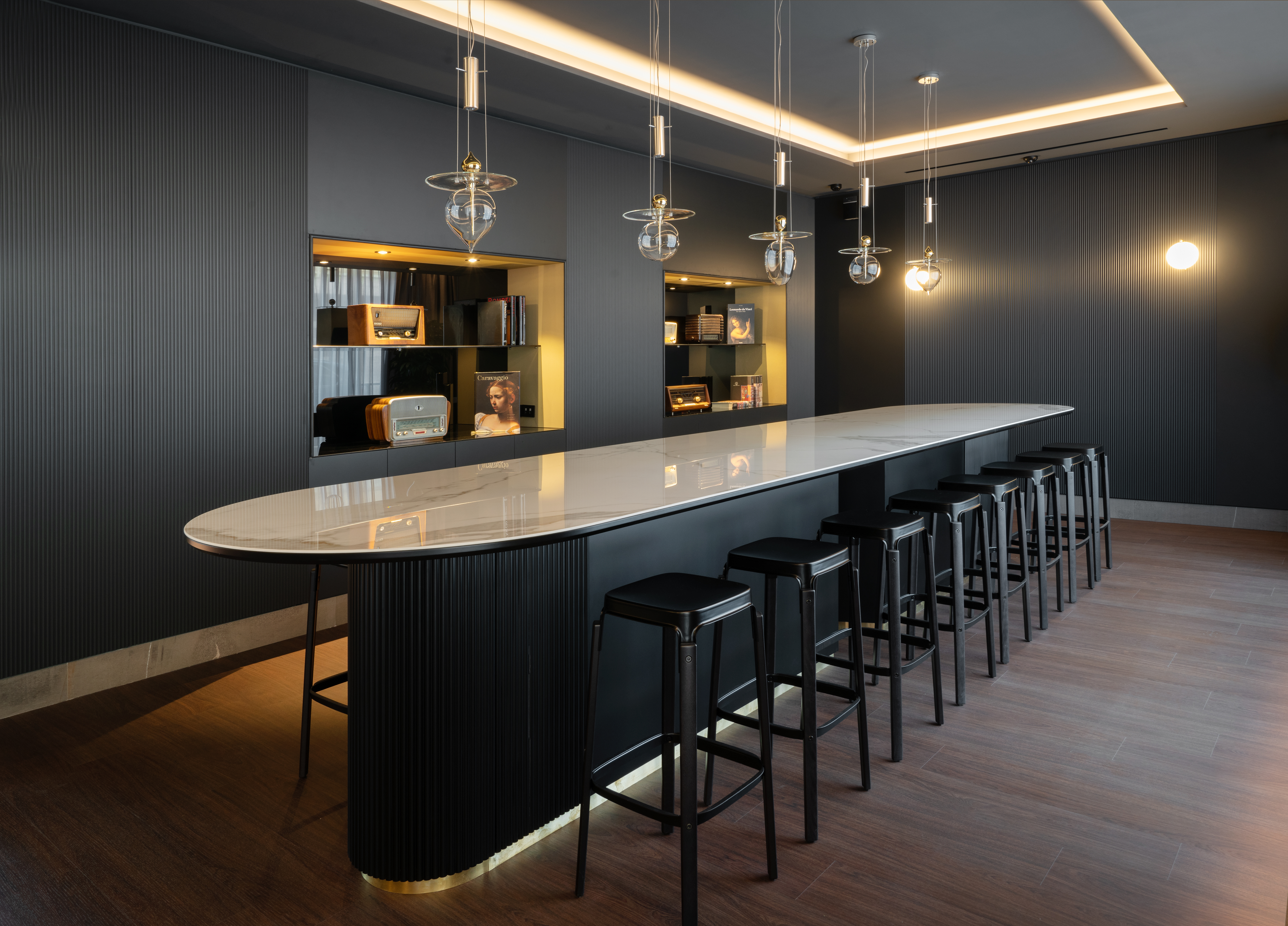Sono stati usati dei cromatismi scuri quali fattori di equilibrio tra le diverse destinazioni d’uso delle aree. I colori sono visibilmente quieti, destinati a contrastare la luce dinamica che riflette la città di Matera nelle sue pietre locali, dai toni tipicamente molto chiari. La profondità cromatica degli arredi e delle pareti assorbe La luce naturale, per offrire un’illuminazione artificiale capace di rilassare i sensi ricettivi.