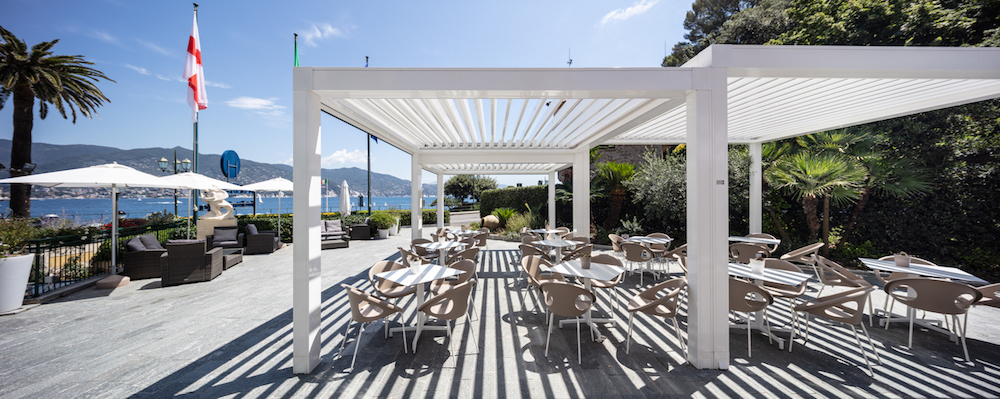 L’Hotel Regina Elena di Santa Margherita Ligure – situato sul lungomare che conduce a Portofino – ha da poco realizzato un intervento di rinnovamento e riorganizzazione degli spazi esterni e installato tre pergole bioclimatiche Opera di Pratic. Lo spazio esterno dell’hotel, non concepito inizialmente per essere fruibile nelle ore più calde, diventa così un’accogliente estensione ideale della veranda esistente. La struttura di Opera, rigorosa e razionale, si integra perfettamente con queste forme e di fatto le prolunga verso la costa.