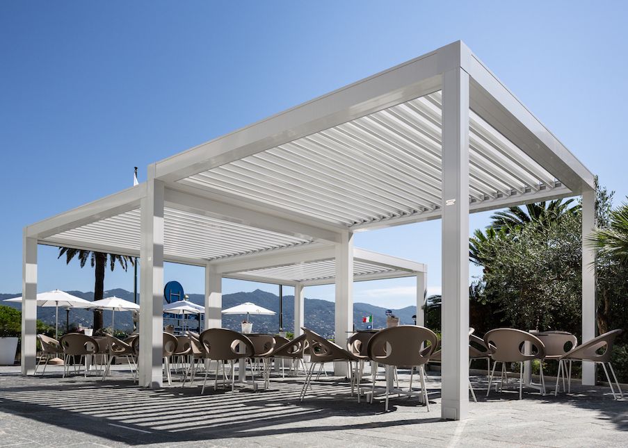 Le tre strutture, in un’elegante colorazione bianco RAL9010, permettono di interpretare l’esterno e di viverlo, così come l’interno, ospitando zona colazione e bar, spazi funzionali e confortevoli, per godere appieno della vicinanza con il mare e della vista incredibile.Grazie alle speciali lame frangisole in alluminio, che possono ruotare di 140 gradi, si può modulare l’intensità della luce e ottenere il naturale ricircolo dell’aria, evitando il caldo che può diventare poco sopportabile nelle ore centrali della giornata.