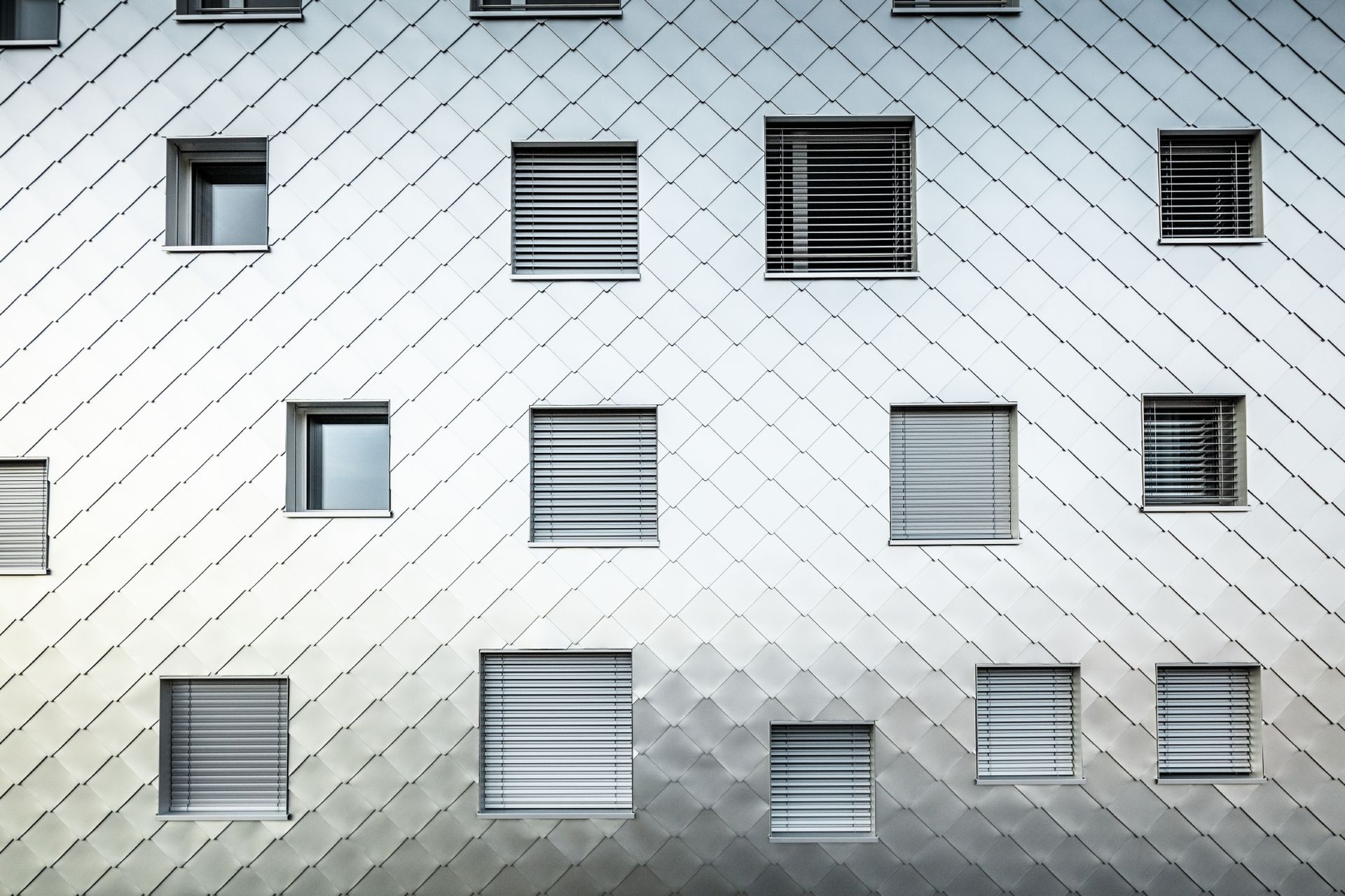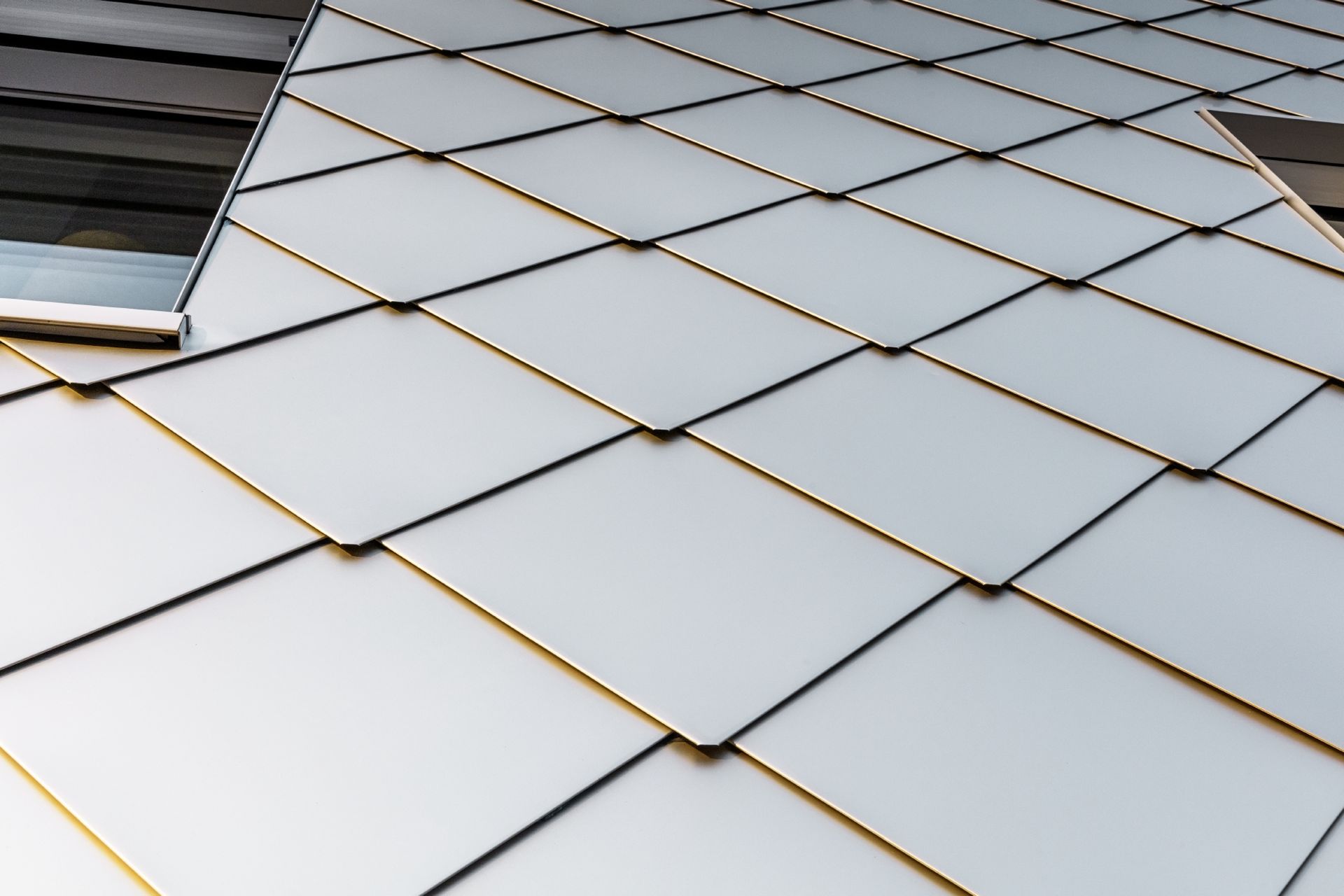 La seconda caratteristica d’impatto della facciata è il suo materiale. Le Scaglie 44×44 di Prefa in alluminio affascinano. Riflettendo delicatamente l’ambiente circostante sulla superficie anodizzata dell’alluminio naturale, lasciano intuire quel che accade intorno e rispecchiano le nuvole e i loro spostamenti nel cielo. Un’altra peculiarità sono gli spigoli sporgenti.
