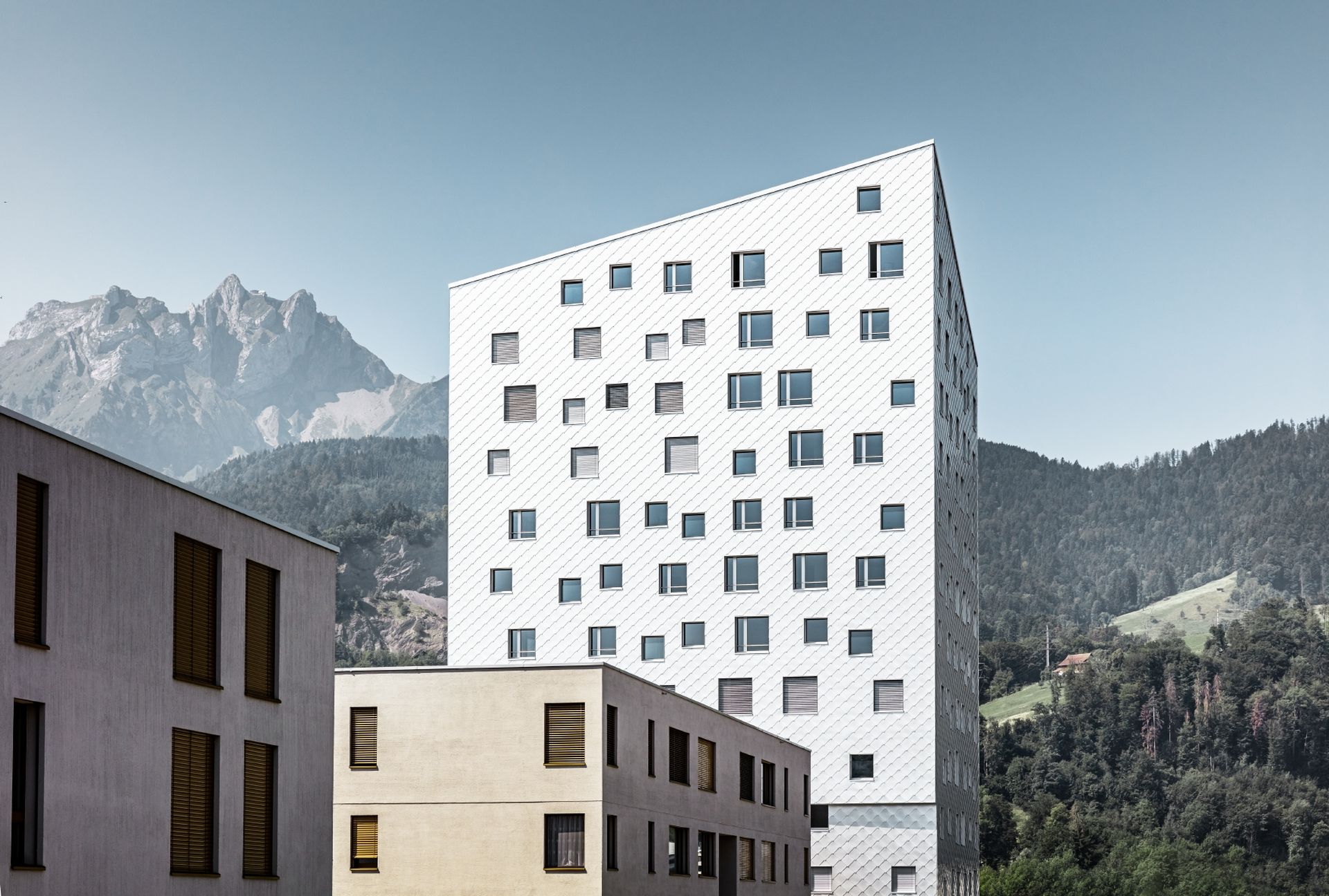 Edifici così alti, in particolare a uso residenziale, sono rari in Svizzera. Le classiche facciate da grattacielo con i loro reticoli stereotipati si addicono agli uffici, per questo Tilla Theus aveva escluso il principio del reticolo a priori.