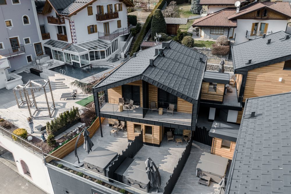 A questi spazi esterni è stata creata una discreta privacy per mezzo di divisori di altezze differenti che richiamano il disegno delle montagne circostanti dal colore antracite, colore che domina tutti i dettagli di finitura utilizzati per completare il villaggio.
