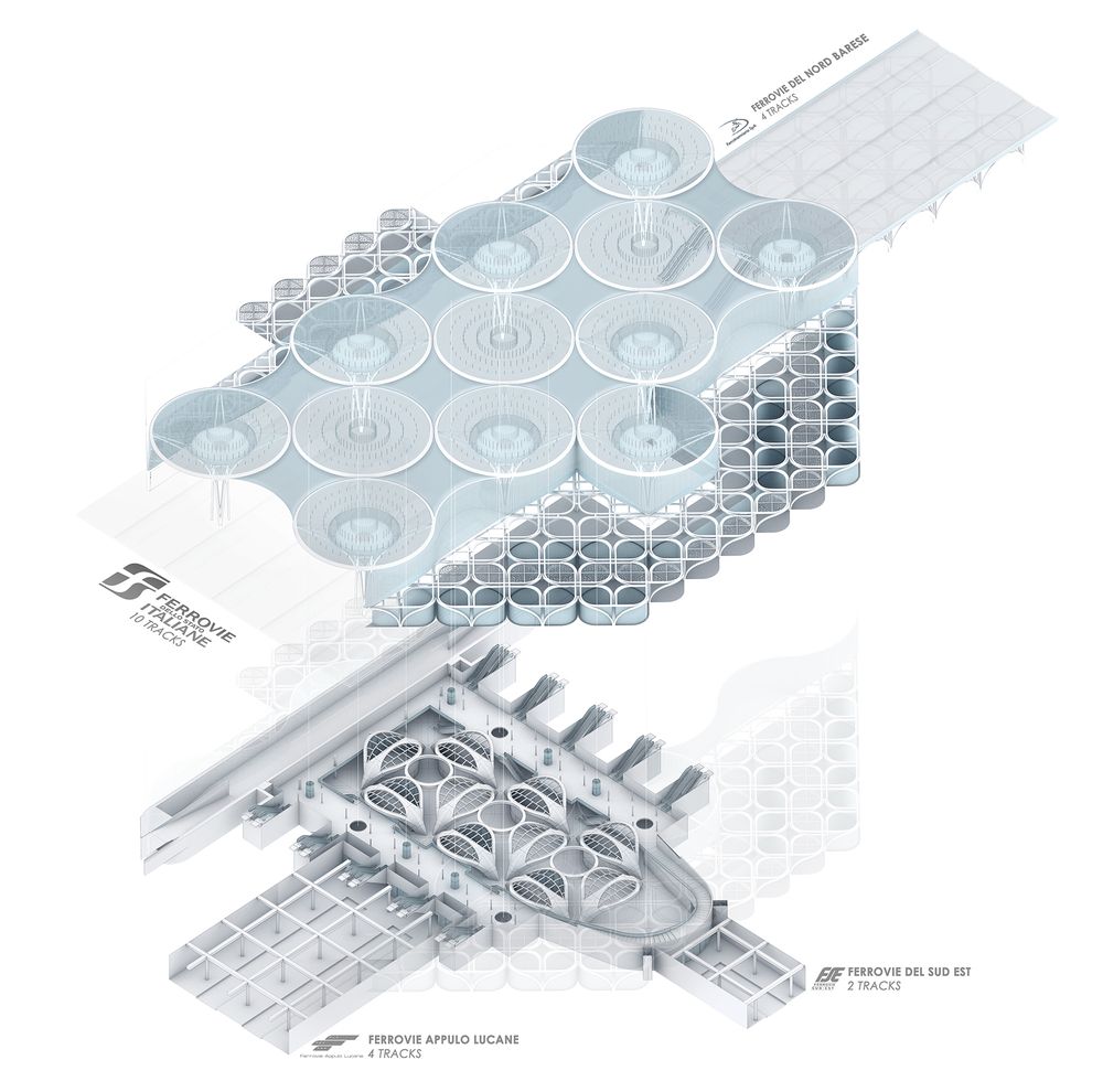 Architettura e tecnologie sostenibili, menzioni d’onore. Maurizio Barberio, Nicola Boccadoro, Micaela Colella, Giovanni Debernardis, Tamara Mazzelli, Angela Nitti, Politecnico di Bari, Facoltà di Architettura, «Nuova Bari Centrale». Esploso.