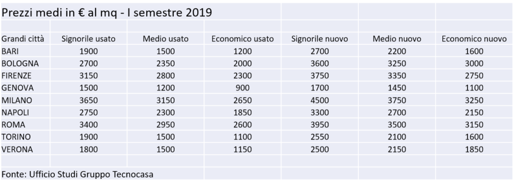 L’Ufficio Studi del Gruppo Tecnocasa ha preso quindi in considerazione le quotazioni di 10 grandi città, calcolando il prezzo medio, riferito al I semestre del 2019, per le diverse tipologie. Soffermandoci sulla categoria medio-usato, la città più cara è risulta Milano con 3.150 € al mq, seguita da Roma con 2.950 € al mq. Al terzo posto Firenze dove il prezzo medio al mq è di 2.800 €.
