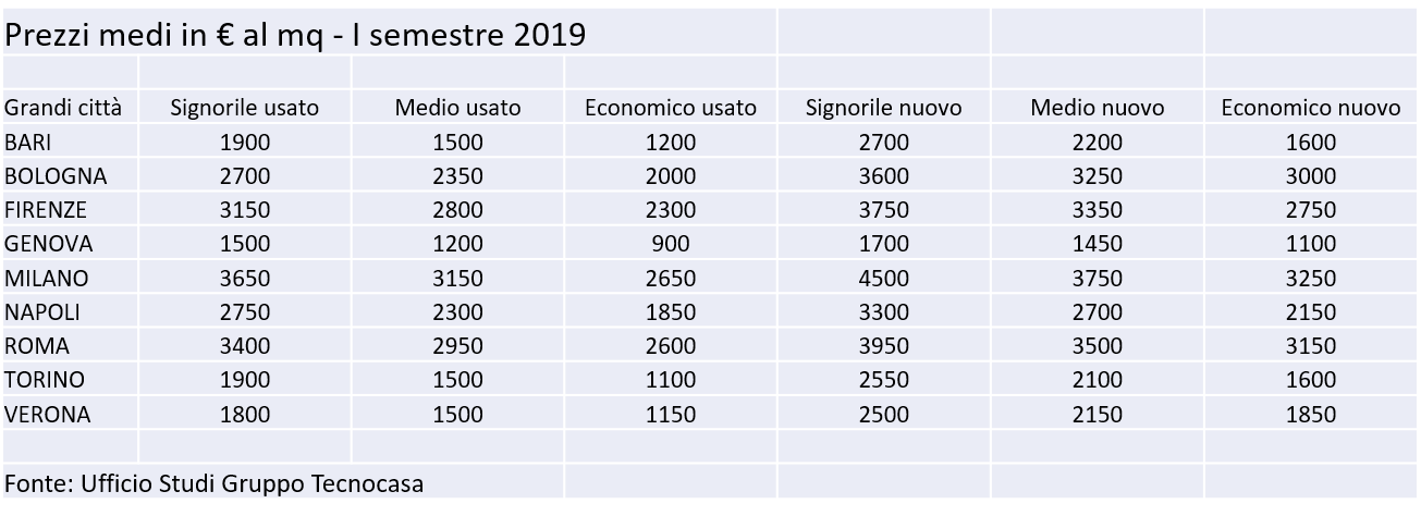 Torino, Verona e Bari denotano prezzi medi al mq identici e pari a 1.500 €. Bologna e Napoli hanno uno scarto di 50 € al mq, presentando rispettivamente quotazioni di 2.350 e 2.300 €.