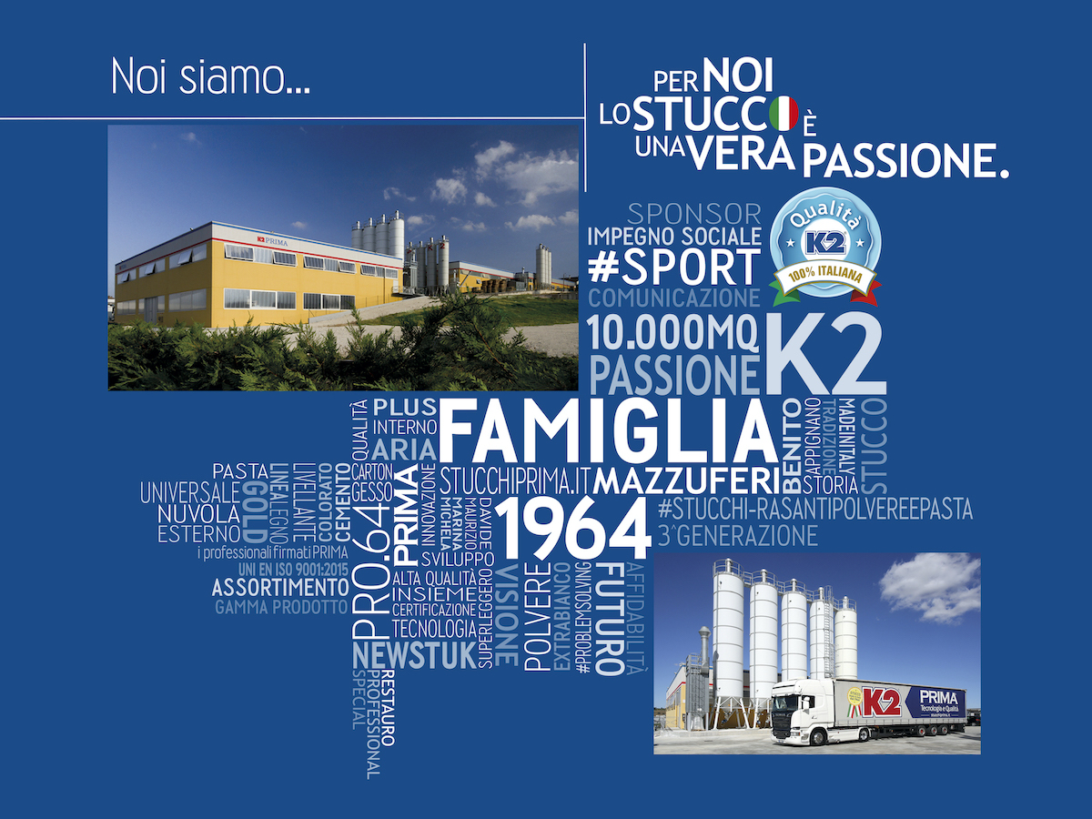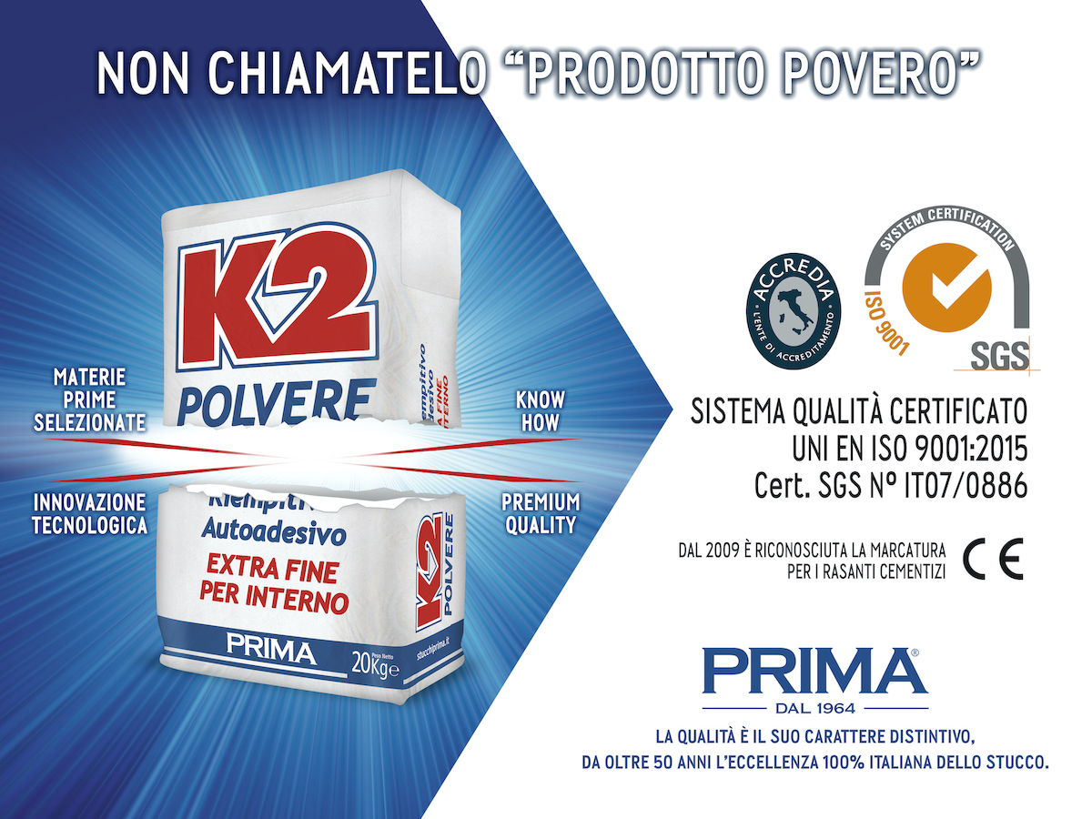 Per Prima, specializzata esclusivamente nella produzione di stucchi per rasature e finiture, gli interventi di potenziamento ed automatizzazione hanno rappresentato le tappe indispensabili di una strategia a lungo termine: la certificazione di qualità Iso 9001, riconosciuta dall’ente certificatore Sgs il 4 giugno del 2007 e successivamente, nel 2009, la marcatura Ce per i rasanti cementizi.