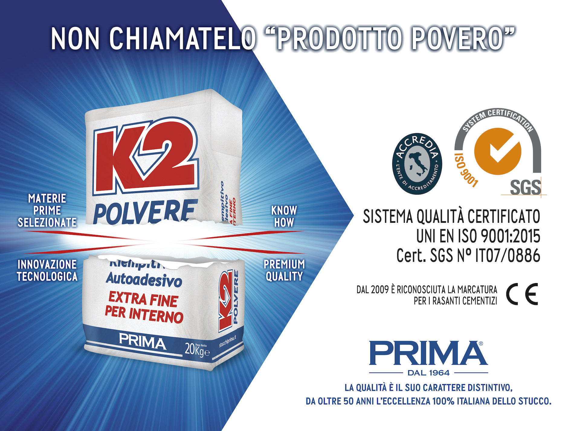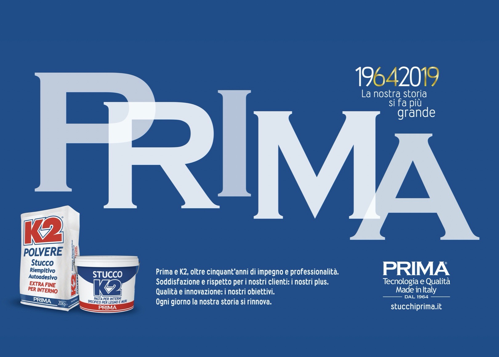 «Siamo i leader italiani nel settore degli stucchi e dei rasanti». Può sembrare un’affermazione presuntuosa, ma non è la Prima a dirlo, è il mercato stesso che lo conferma. In questi ultimi anni la Prima ha consolidato e rafforzato la sua posizione, grazie ad una visione lungimirante derivata dalla sua tradizione e dallo spirito imprenditoriale del suo fondatore storico il Cav. Benito Mazzuferi, che accomuna la seconda e terza generazione oggi alla guida dell’azienda di famiglia nata nel 1964.