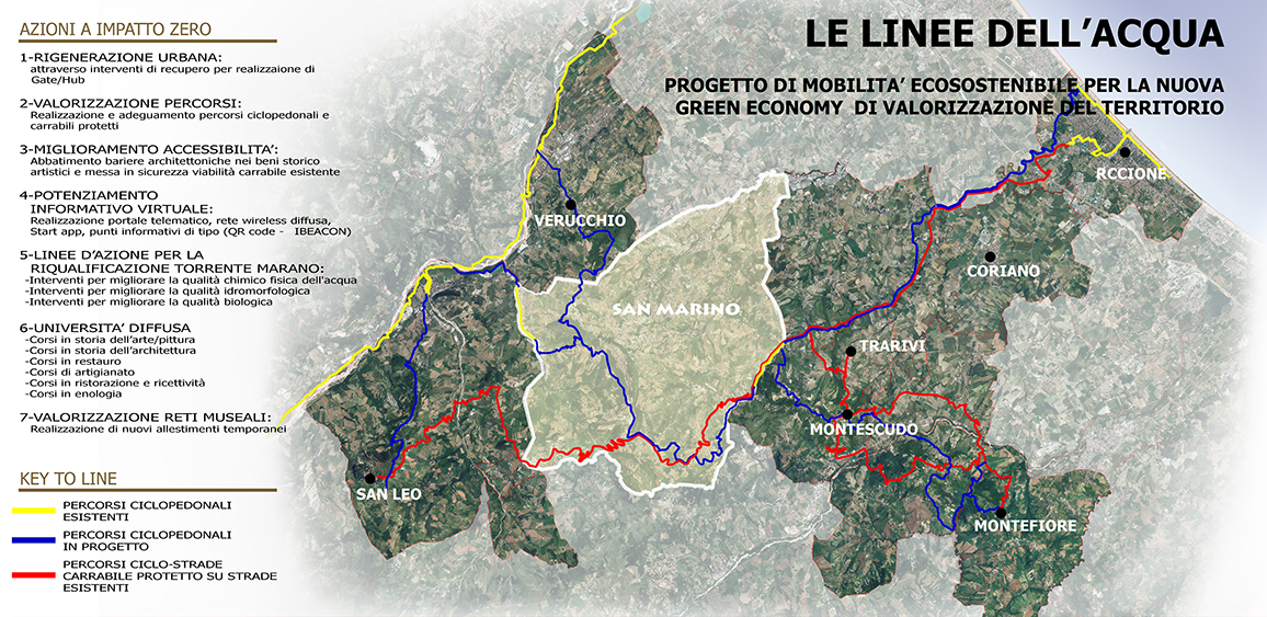 • i comuni di Riccione e di Coriano assieme all’Università degli Studi di San Marino con il progetto «Le linee dell’acqua», un percorso di ecosostenibilità fatto di vie carrabili e ciclopedonali;