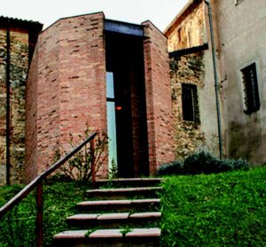 Per ottenere un effetto di continuità con il rudere sono state realizzate murature composte da laterizi pieni di colore intenso e uniforme (pezzi speciali sono stati appositamente disegnati dal progettista) sovrapposti senza fuga, generalmente arretrati rispetto al piano delle facciate storiche.