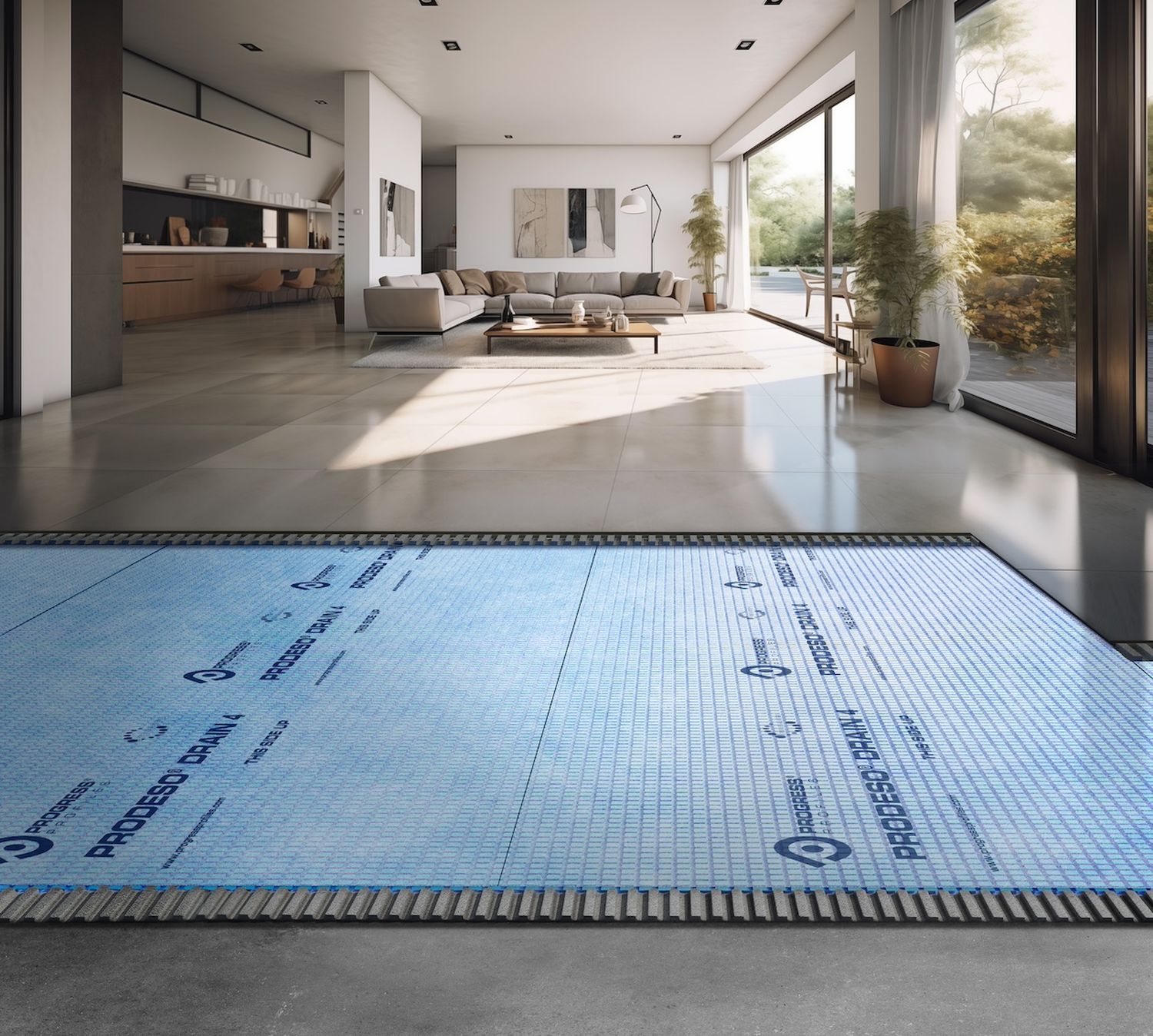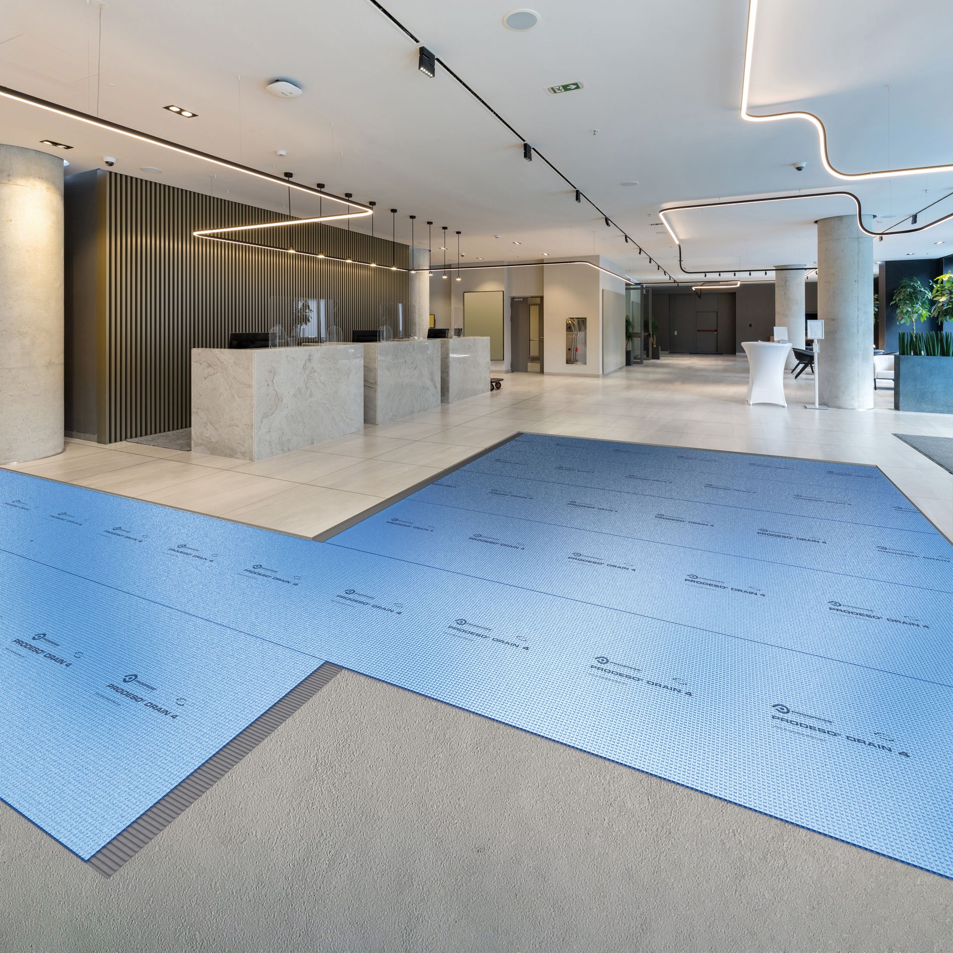 La “camera d’aria” che Prodeso Drain 4 crea al di sotto del pavimento, tra il tessuto drenante in polipropilene e la lastra in polietilene, favorisce una microventilazione e consente una rapida e uniforme asciugatura dell’adesivo, riducendo drasticamente la risalita dei triacetati presenti negli stessi adesivi e la comparsa di efflorescenze nelle fughe.