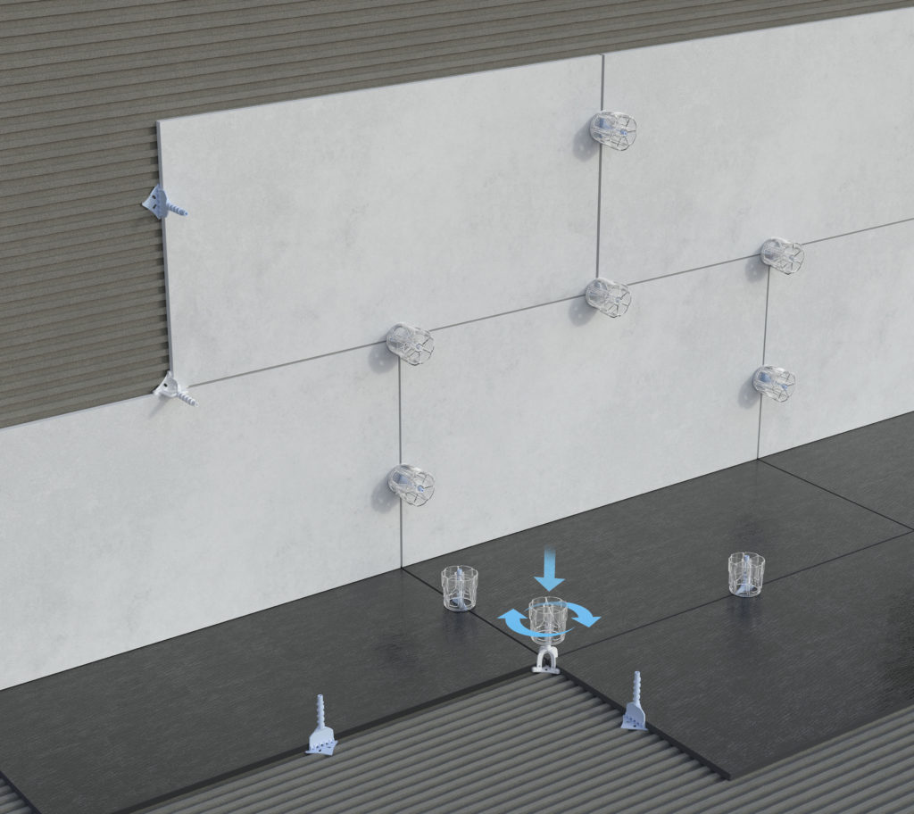 Proleveling System è costituito da due soli elementi pratici e facili da utilizzare e non necessita l’utilizzo di pinze o altri attrezzi. Una base livellatore permette di separare e accostare pavimenti in ceramica, marmo, pietre naturali o bassi spessori, assicurando perfetta planarità del pavimento e/o del rivestimento. Conformabili a qualsiasi materiale di medio e grande formato, i livellatori hanno uno spessore che varia da 1 a 5 mm e si differenziano in base alle fughe e agli accostamenti desiderati: quelli a croce e lineari consentono la realizzazione di una posa in linea, mentre con i livellatori a mezza croce e lineari è possibile ottenere una posa a correre. Il nuovo colore azzurro del livellatore lineare, inoltre, ne facilita il riconoscimento, per una messa in opera più semplice e rapida. Il sistema comprende anche un tirante trasparente e forato che, inserito nello stelo sfilettato della base livellatore, permette di regolare la pressione sulla superficie e di allineare le linee di fuga delle piastrelle con precisione, garantendo un perfetto fissaggio.