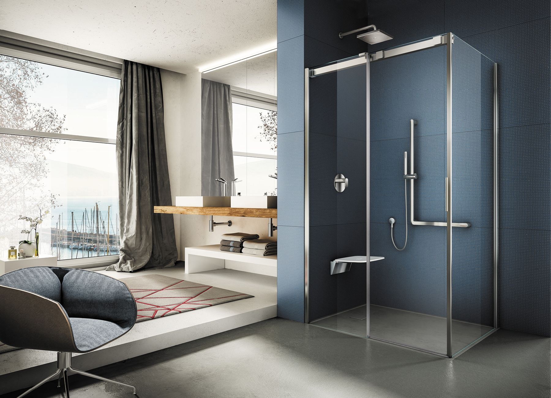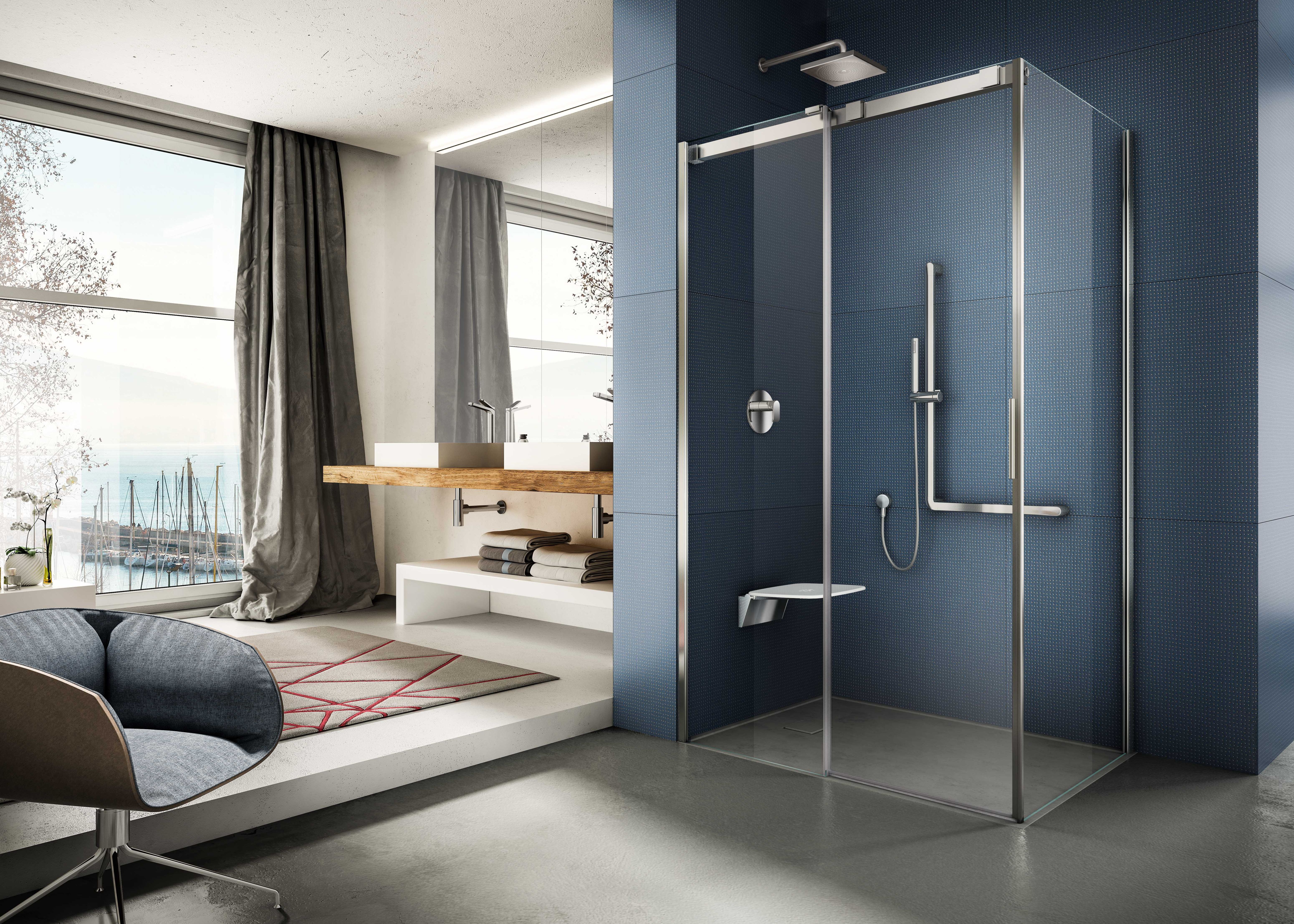 Il meccanismo di scorrimento è interamente alloggiato nelle ruote a cuscinetto, collocate nella parte superiore del vetro mobile e regolabili in altezza per fronteggiare all’eventuale pendenza del pavimento. Le porte sono facilmente sganciabili per consentire una pulizia più semplice e accurata e il profilo murale è dotato del sistema “Easy-Fix” che permette una facile regolazione del profilo e internamente è completamente liscio per una pulizia più agevole.