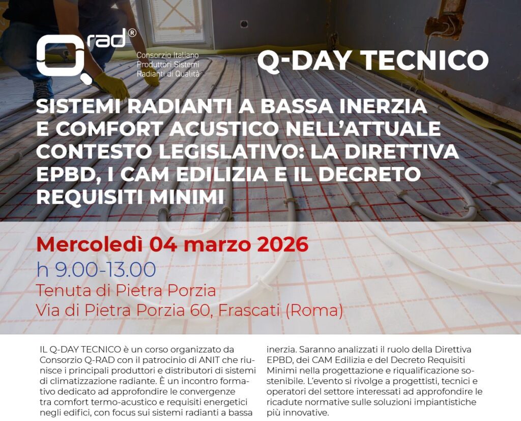 QDay Tecnico a Frascati il 4 marzo: un evento formativo con focus sui sistemi radianti a bassa inerzia, Direttiva Epbd, Cam Edilizia e comfort termo-acustico organizzato da QRad. Cfp riconosciuti.