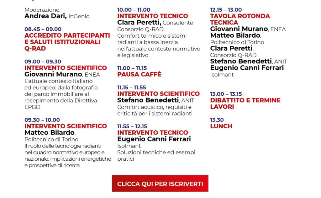 La giornata, in programma dalle ore 9.00 alle 13.00 del 4 marzo, è dedicata alle convergenze tra comfort termo-acustico e requisiti energetici negli edifici, con un focus centrale sui sistemi radianti a bassa inerzia e sul loro ruolo nel quadro legislativo europeo e nazionale.