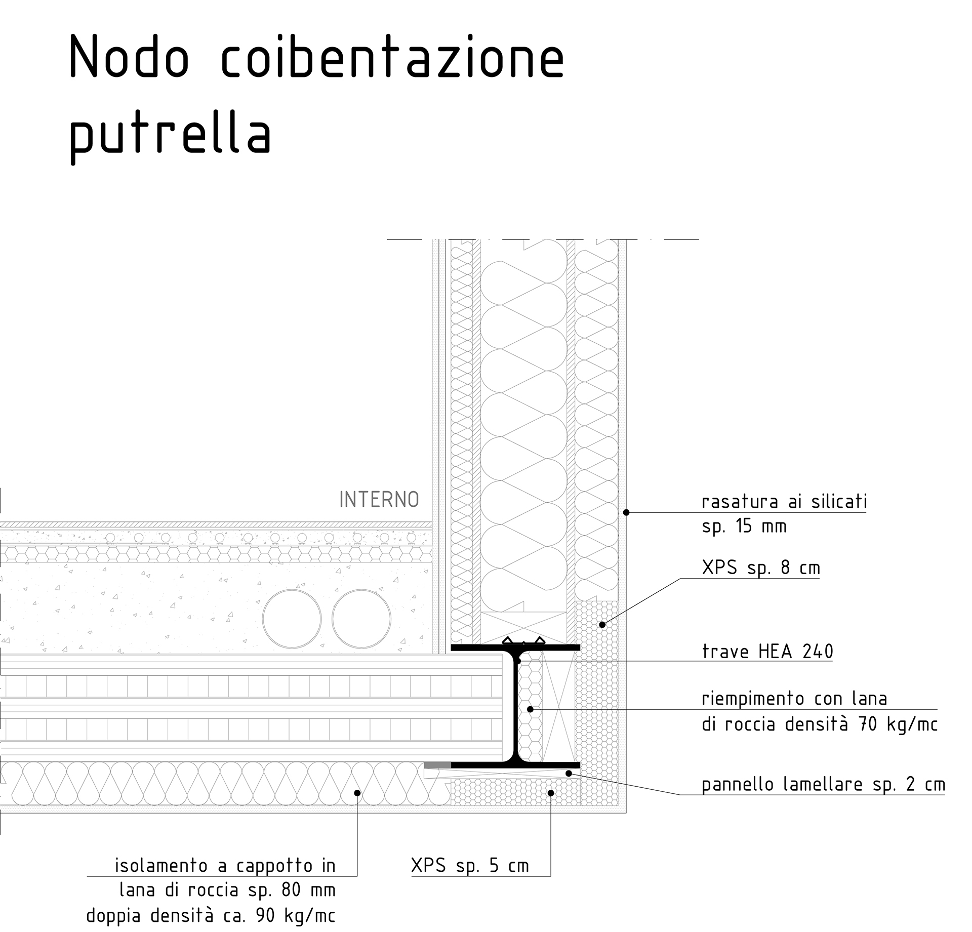 La stratigrafia del pannello perimetrale è costituita da un telaio in legno lamellare spessore 160 mm interposto da pannelli in lana di roccia con densità 70 kg/mc, pannello Osb per il controventamento della parete su ambo i lati; sul fronte esterno cappotto in lana di roccia spessore 80 mm densità media 90 kg/mc, rasatura ai silicati e sul fronte interno un’intercapedine impianti spessore 50 mm con interposizione di pannelli in lana di roccia spessore 40 mm e densità 40 kg/mc e placcatura con doppia lastra in cartongesso spessore 12.5+12.5 mm. Per uno spessore complessivo di 360 mm.