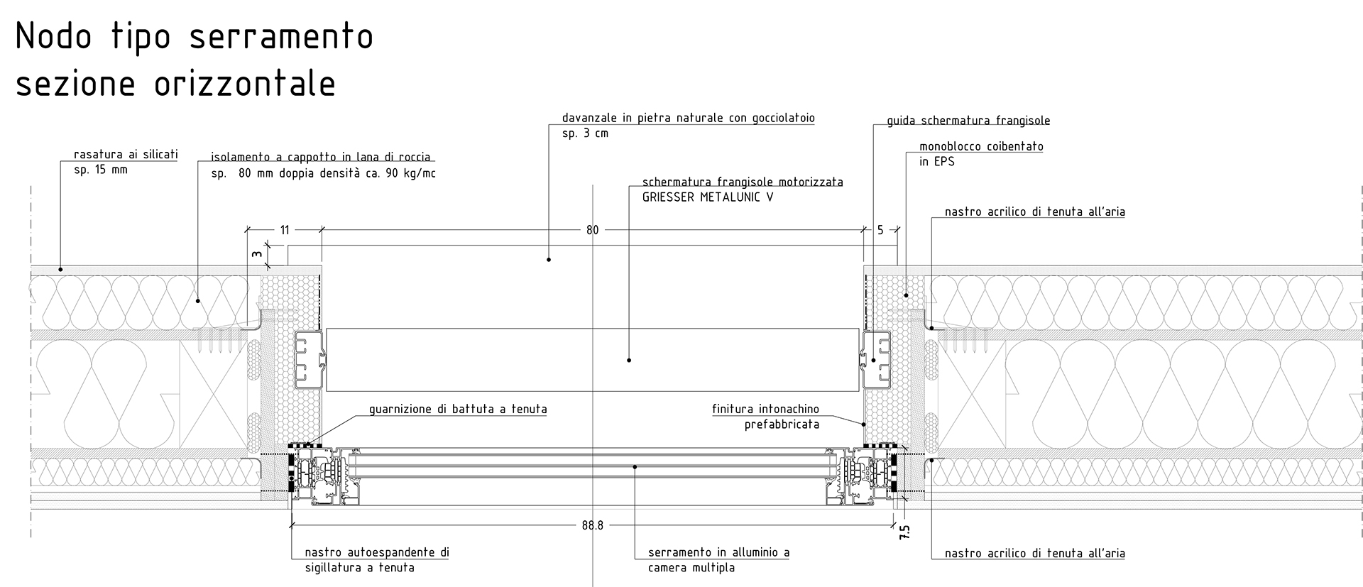 Per i serramenti è stato definito uno specifico abaco che ha coinvolto i principali referenti. Le finestre sono in alluminio a triplo vetro interposto da Argon altamente isolanti, presenta schermature mobili frangisole a scomparsa e monoblocchi coibentati.