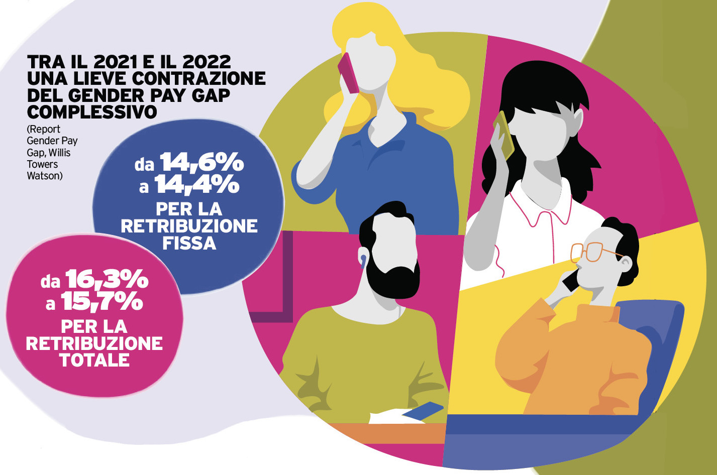 In questo contesto, tra il 2021 e il 2022, Willis Towers Watson (società che fornisce soluzioni supportate da analisi ed esperienza nelle aree People, Risk e Capital) registra una lieve contrazione del gender pay gap complessivo, che passa dal 14,6% al 14,4% per la retribuzione fissa e dal 16,3% al 15,7% per la retribuzione totale. Nel dettaglio delle 475 aziende che hanno fornito informazioni retributive di genere: nell’87% dei casi la retribuzione fissa media delle donne è inferiore a quella degli uomini e meno di un quarto dei dirigenti e circa un terzo dei quadri è donna. Isolando il 25% delle aziende con una maggiore presenza femminile nella popolazione manageriale, la percentuale di donne dirigenti sale al 37% mentre, sul versante opposto, nel 25% di aziende con una minore presenza femminile nella popolazione manageriale la percentuale di donne dirigenti scivola all’8%. Un ultimo aspetto da considerare è che il divario retributivo di genere per qualifica aumenta al crescere del livello di inquadramento contrattuale, passando dal 4% per gli operai al 10% per i dirigenti. Solo 20 aziende su 100 vantano, infine, un gender pay gap per qualifica vicino allo zero.
