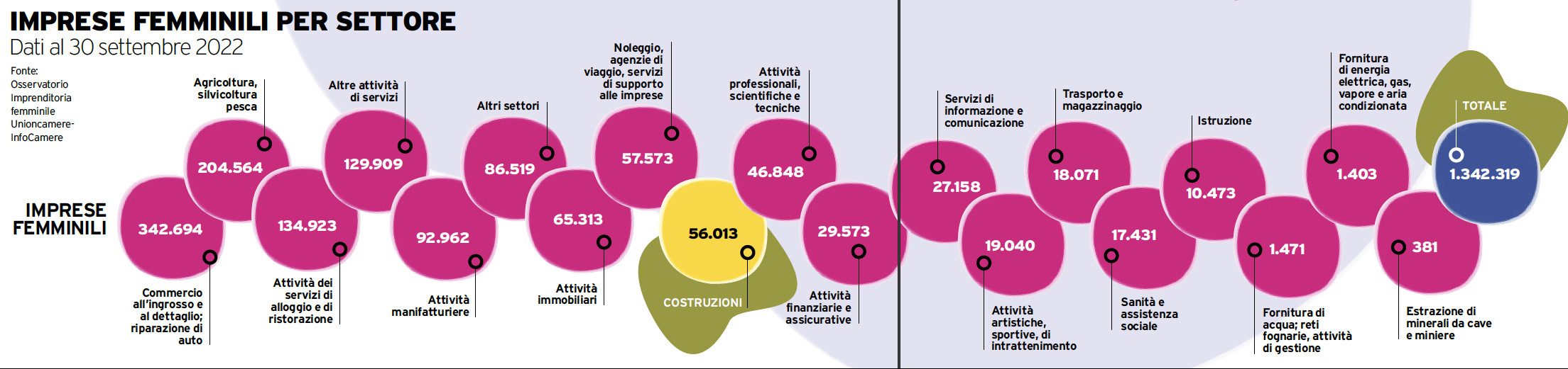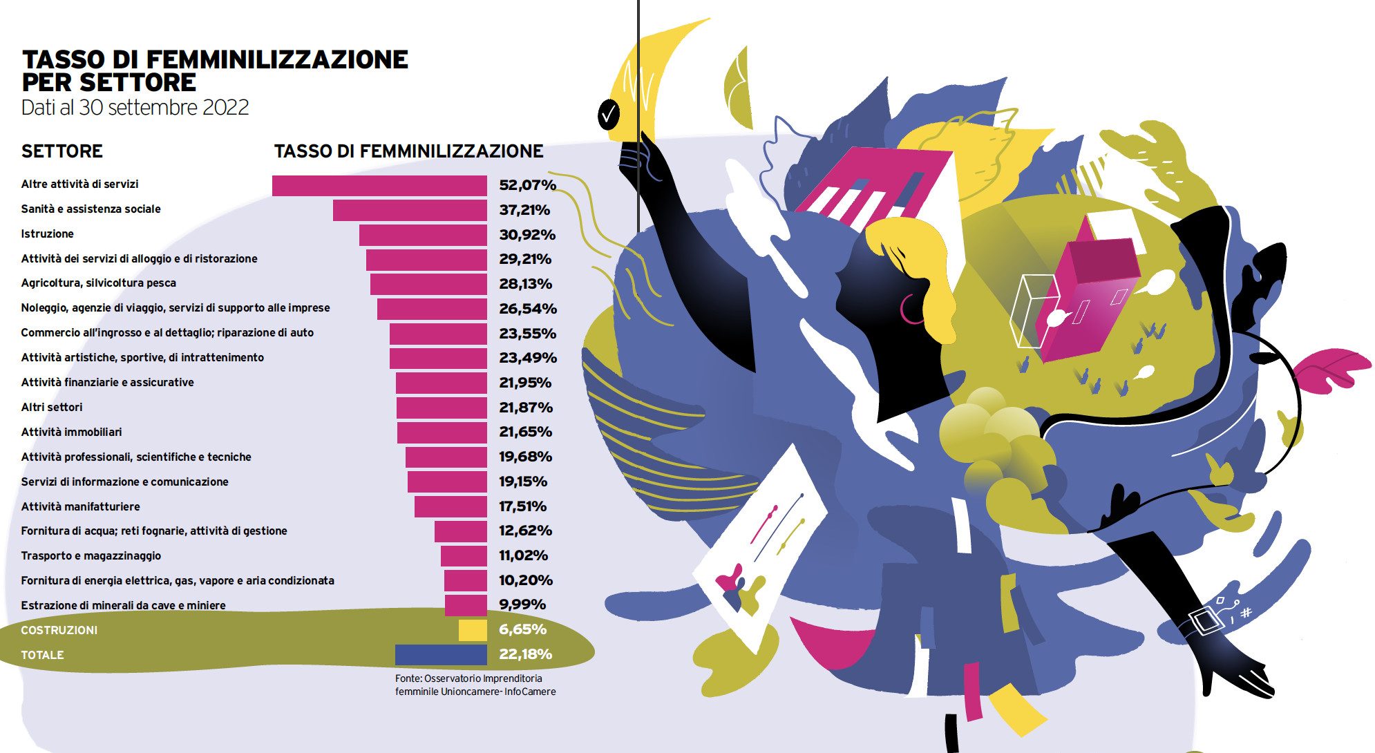 E l’edilizia? Si trova all’ultimo gradino della classifica con il 6,65% di tasso di femminilizzazione e all’undicesimo per numero di imprese femminili.