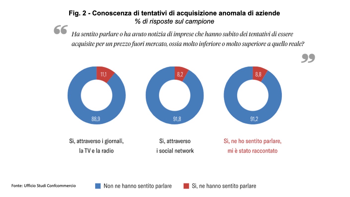 Approfondire questi temi, per giunta attraverso un’indagine rapida, è molto difficile a causa della normale reticenza dei rispondenti a dichiararsi su questioni sensibili (come l’esperienza di vittimizzazione rispetto a fenomeni criminali). Questa reticenza appare cresciuta durante la pandemia: in altre indagini effettuate da Confcommercio in passato su analoghi argomenti, l’esperienza diretta o indiretta relativa a minacce, estorsioni e usura viene dichiarata da percentuali più che doppie (20%) rispetto all’indagine attuale.