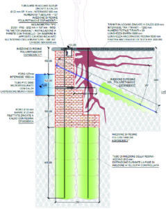 L’intervento sul muro di sponda, caratterizzato da una geometria molto variabile per profondità, spessore e presenza di rastremazioni interrate, ha comportato la messa in opera di quattro tipologie d’opere: