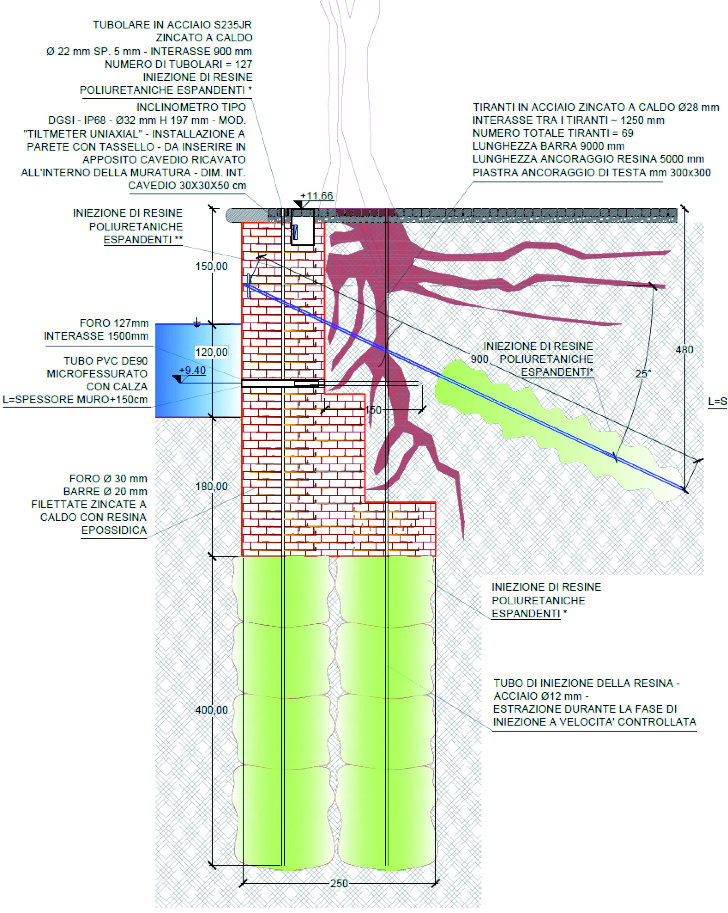In testa a ciascun tirante la massa di resina poliuretanica ha formato un bulbo di lunghezza minima pari a 5 metri e diametro medio pari a 30 cm. Sono state inoltre installate delle piastre di ripartizione del carico in acciaio zincato e si è provveduto al pre-tensionamento dei tiranti con chiave dinamometrica.