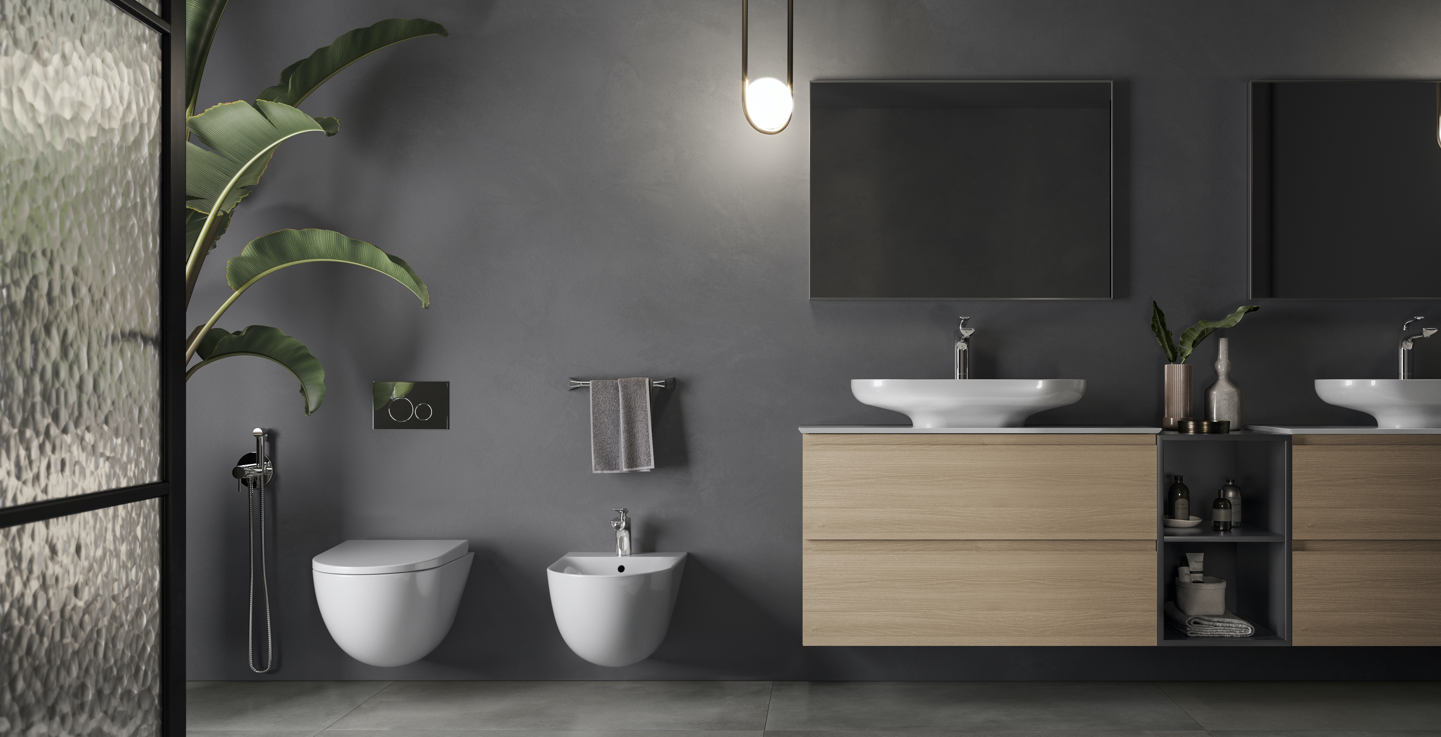 Si tratta di una collezione che si posiziona nella fascia medio-alta e che include oltre ai sanitari, i lavabi a catino e freestanding dalle linee essenziali, quasi minimaliste.
