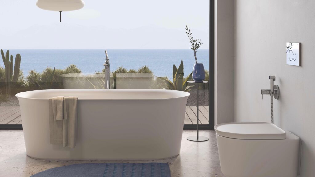 Una soluzione stilistica di grande effetto: troviamo dunque forme decorative con profili sottili per i lavabi, grande ricerca stilistica per la vasca e le linee dei sanitari che si “allungano”.